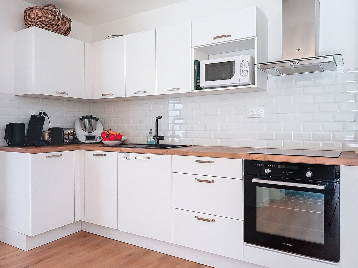 🎯 Rennes stadscentrum. Op 🚶🏻♂️ 3 minuten lopen van bars en restaurants. ❤️ Perfect voor een stel. 📐 50m² met woonkamer + slaapkamer + keuken. 🚘 Gratis privéparkeerplaats. 🖥 Snel glasvezelinternet. 🖼️ Panoramisch uitzicht op het centrum. 🍜 Keuken van alle gemakken voorzien, doucheruimte. 🛋️ Woonkamer met bank, 4K TV, Netflix, YouTube. 👮♂️ 24-uursbeveiliging in het gebouw.