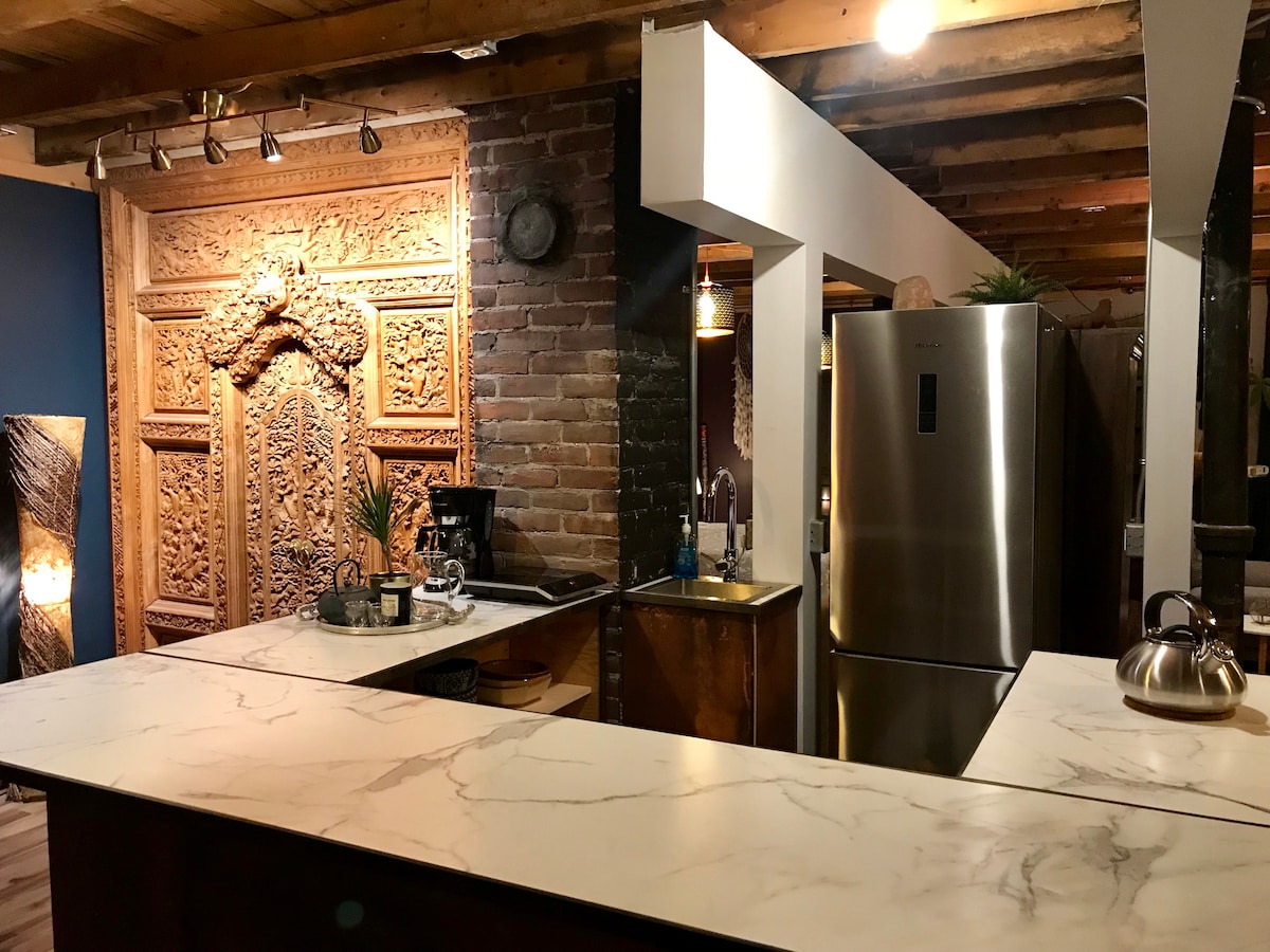 No d'établissement: 301489 Accès au loft entier. Il y a 3 chambres (2 pas de fenêtre) ainsi qu'un divan-lit dans l'aire ouverte et un dans une chambre. Pas de fenêtre qui s'ouvre. Style hôtel, mais il y a une cuisinette. Vous avez tout ce qu'il faut pour cuisiner. Il n'y a pas d'évier de cuisine. Il y a un bac pour faire la vaisselle que vous remplissez dans la salle de bain. Le loft est situé sur la rue principale à 2 min du centre-ville et 10 min à pied. (Bruit traffic) WIFI et télévision.