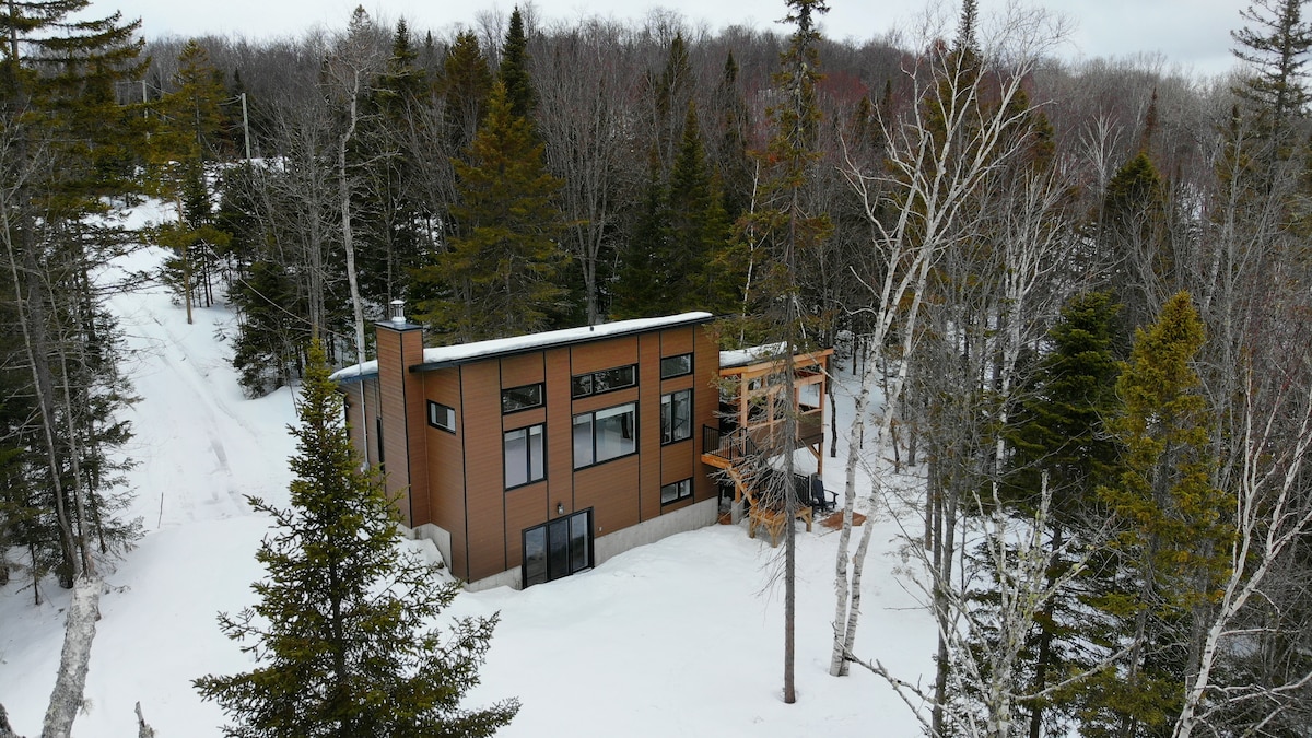 Ons Scandinavisch boschalet is perfect om quality time door te brengen als een stel (of met een kind), of voor een work-retreat (met snelle wifi). Het houten interieur is warm en gezellig. De ramen op volledige hoogte bieden een prachtig uitzicht over een beboste vallei. De open keuken en woonkamer houden je in het gesprek tijdens het koken. Als je liever buiten kookt, is er een vuurplaats met een grill en een eettafel in de buitenlucht. Slechts 70 minuten rijden van Montreal. Het meer ligt op 25 minuten lopen als je in de buurt parkeert.