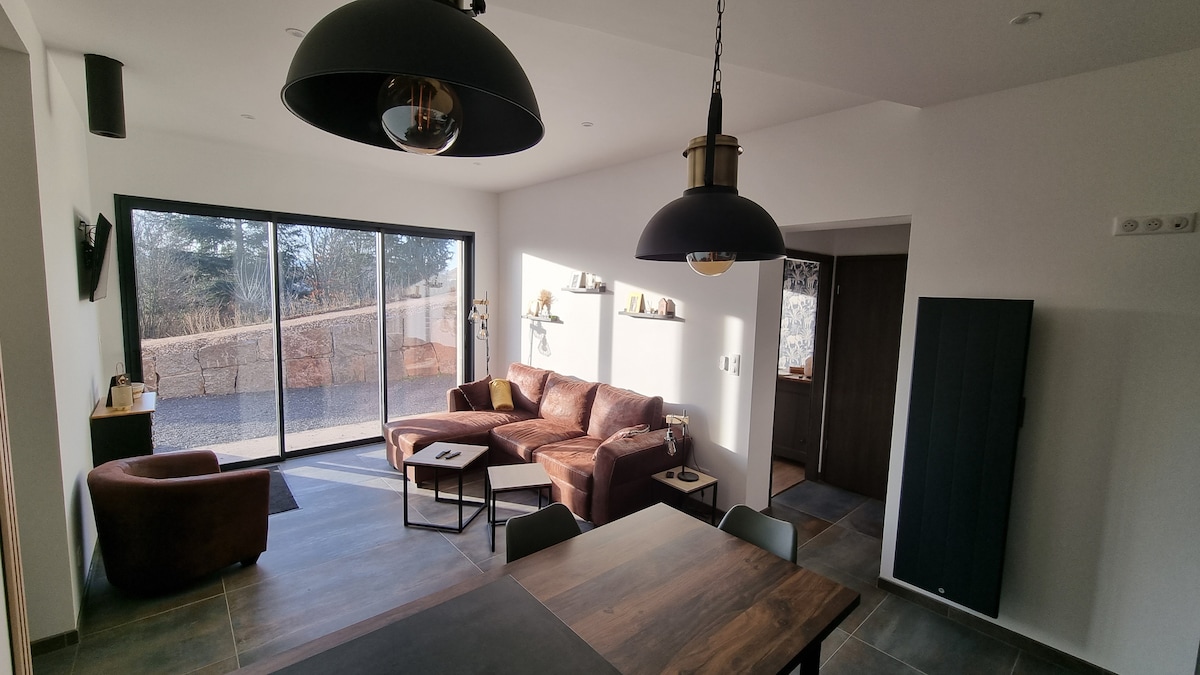 Ontspan in deze NIEUWE, rustige en stijlvolle woning gelegen in een NIEUW huis op een paar minuten lopen van het centrum, dicht bij wandelpaden of mountainbiketochten. Zonnige buurt en dicht bij de natuur. Volledig ingericht met uitgeruste en ingerichte keuken open naar woonkamer ( slaapbank voor 2 extra personen) toegang tot het terras, 1 slaapkamer op terras, doucheruimte (Italiaanse douche), wc, voorraadkast (wasmachine). Paraplubed. Eigen parkeerplaats Garage mogelijk motorfietsen.