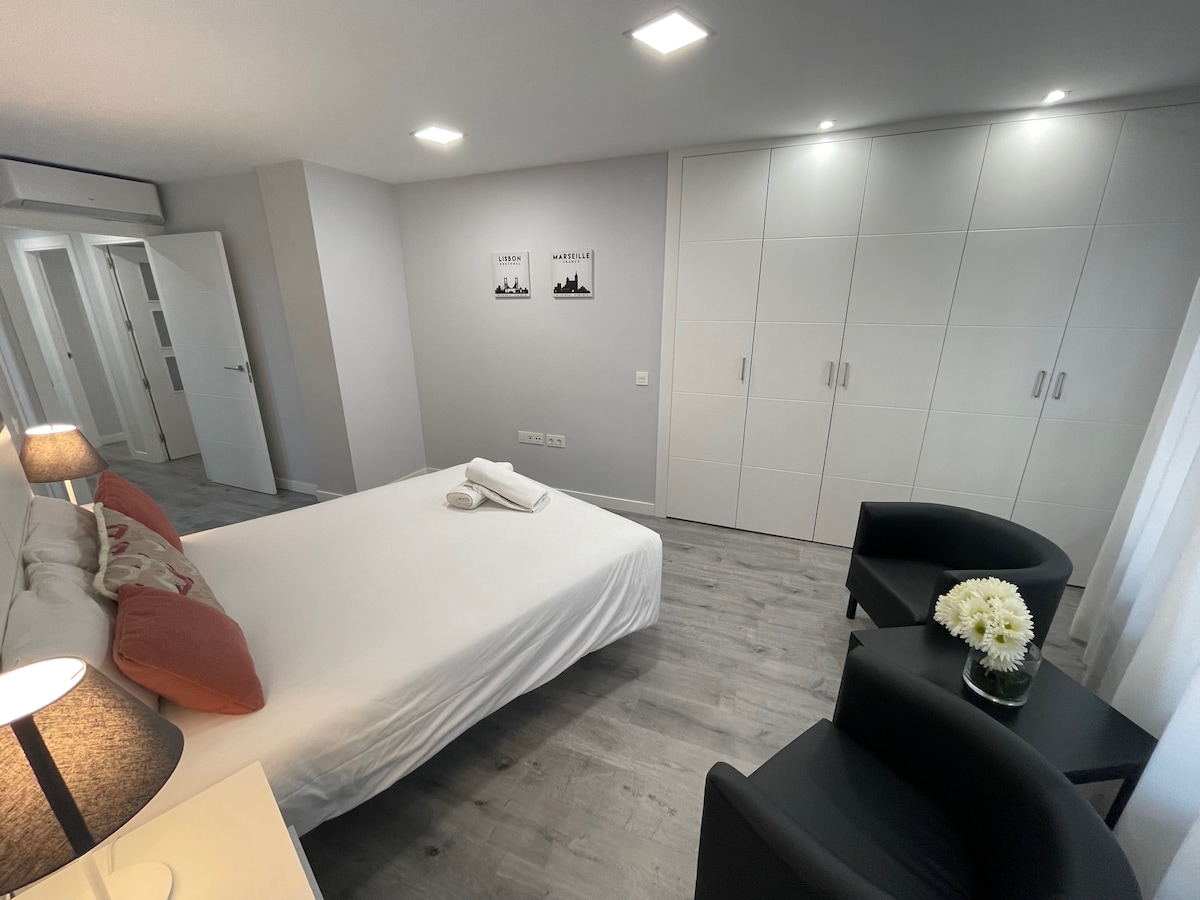 Appartement in het centrum van Salamanca, op 8 minuten van Plaza Mayor en het historische centrum van de stad. Dichtbij het busstation, de universiteit en de ziekenhuizen. Zeer rustige buurt met gemakkelijk gratis parkeren en parkeren in de buurt. Zeer licht, twee slaapkamers, met twee tweepersoonsbedden en een bankbed. Volledig uitgerust: vaatwasser, oven, kookplaat, kookplaat, wasmachine-droger. Ruime woon-eetkamer met led-tv, wifi en individuele verwarming.