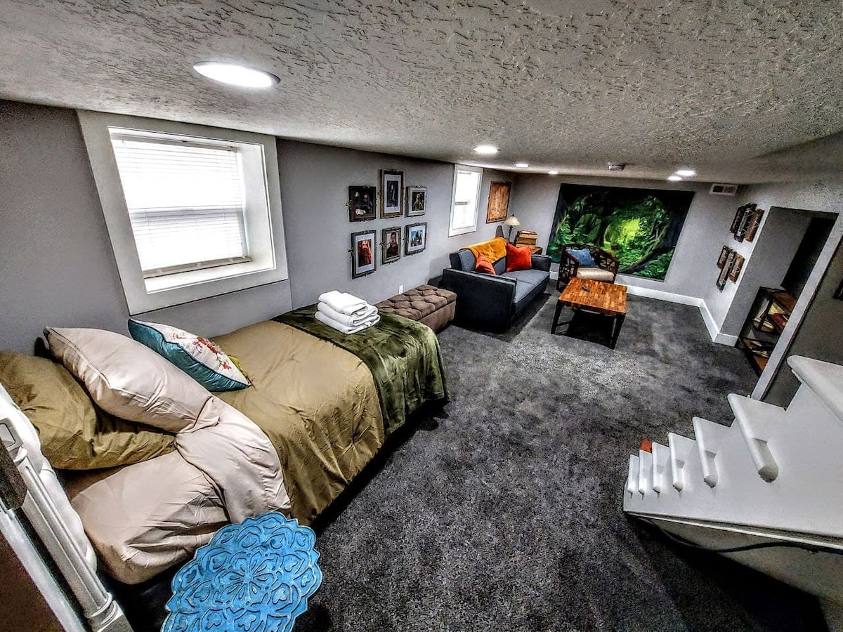Comfort, stijl en hobbit; mix voor een SLC-verblijf als geen ander! Voor grote feesten kun je genieten van onze bovenste verdieping met plafonds van 3 meter, 1 kingsize bed, 1 queensize bed, 1 futon voor een 55-inch Smart TV en 1 wieg. Voor korte feestjes Ga naar de Hobbit Hole voor een extra Queen, 2 Twins, & 1 uitklapbare Futon voor een 55 55-inch tv. De Hobbit Hole is milieuvriendelijk. We hebben materiaal bespaard en de plafonds slechts 1,5 meter hoog gehouden! Reus voor een hobbit! Hoge eend! Lage plafonds in de kelder!