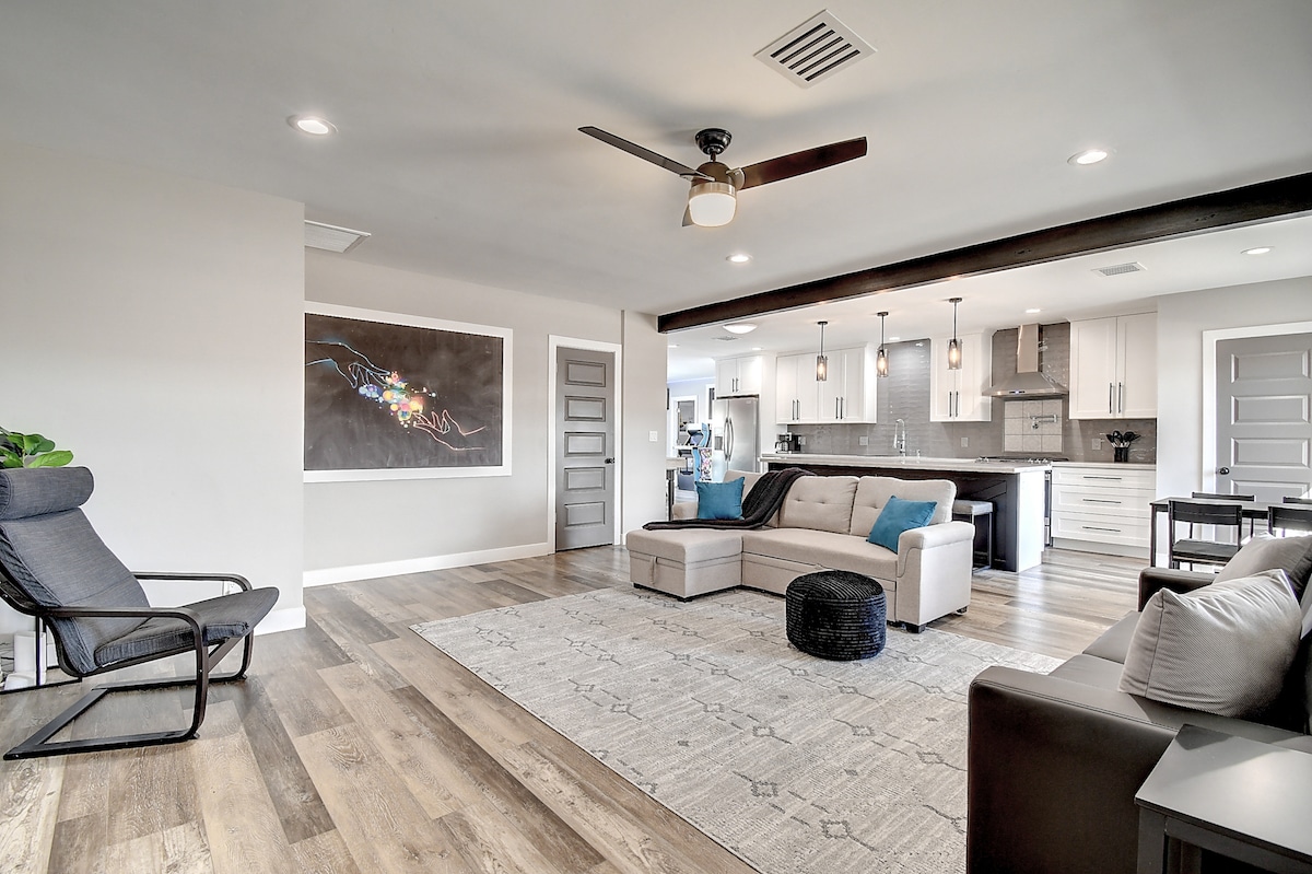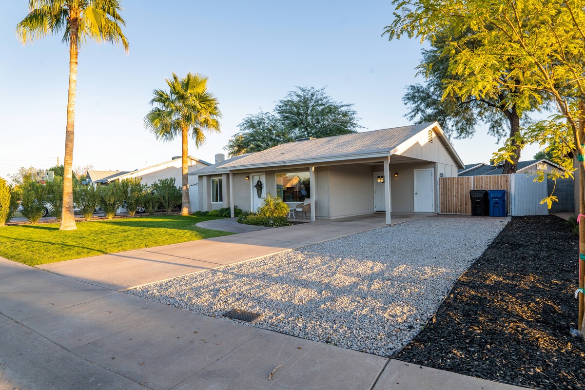 Welkom in Tempe! Dit 2BR/1BA huis heeft alles wat je nodig hebt voor een ontspannen verblijf. Volledig uitgerust met dimbare slimme verlichting en luidsprekers in elke kamer, met een onlangs gerenoveerde keuken en badkamer met een spa-achtige ervaring in het bad, wasserette in de unit, snel internet, 86 inch 4K-tv (alle belangrijke streaming- en 300+ filmcollectie, met 5.1.4 surround) en een eigen achtertuin, is perfect voor een snelle reis naar de stad, filmavond of achtertuin-dagverblijf!