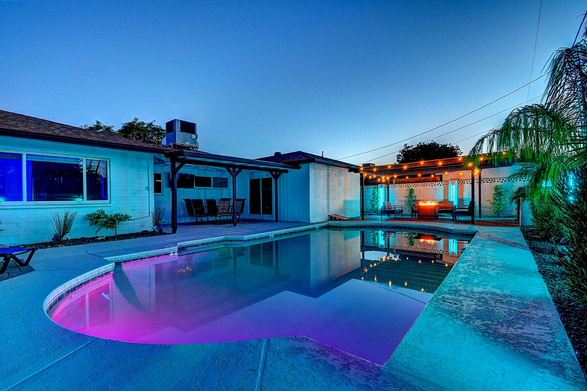 Airlume Stays presenteert: De Mulberry, een luxe toevluchtsoord voor de geest en ziel. Deze onlangs gerenoveerde woning heeft eindeloze mogelijkheden: 6 echte slaapkamers/3 badkamers met 10 bedden op enkele minuten afstand van de oude binnenstad, Spring Training en PHX. Uitgebreide patio met nieuw bubbelbad en cabana. Of je nu wilt herenigen met vrienden of wilt genieten van een ontspannend uitje met perfecte ochtenden genesteld in hotellinnen en 's avonds loungen in onze designer cabana, The Mulberry is zorgvuldig ontworpen om te inspireren en te kalmeren.