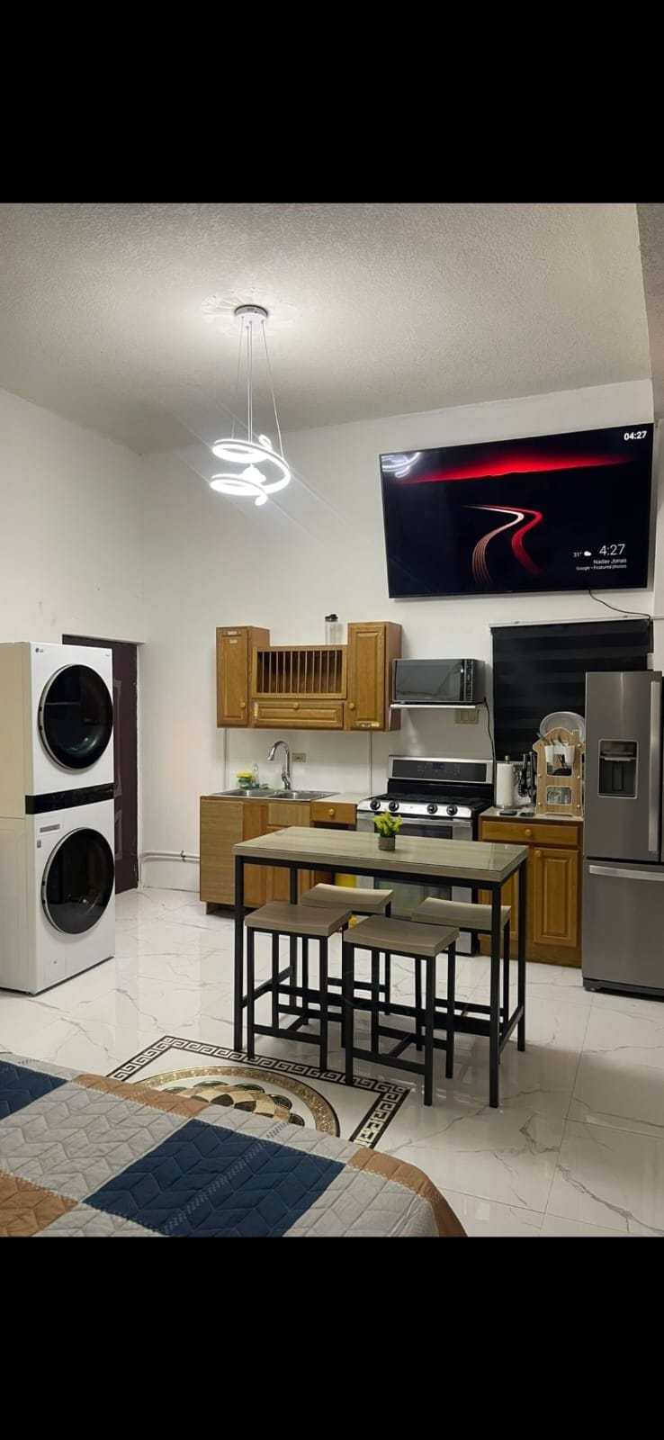 Modern Home Gated. Fully Solar 1 King size bed, 1Q-B, 2baths located in Old Harbour with GAZEBO and BAR. This amazing home also decked with LED Lighing, 1 fancy Kitchen an laundry. It's fully A/C and grilled with 24/7 security, Smart lock, Free NetFlix, also CCTV Cameras for your safety, a fire place. All furnitures are brand new to suit your needs. This is situated closed to the Town, Restaurant, Jerk Centre, KFC, Juici Beef, High 2000, 30mins portmore spanish Town 1 hour to Ocho Rios.