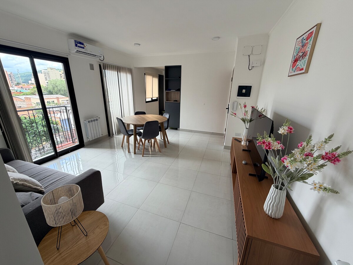 Dit gezellige appartement is gelegen in een van de beste gebieden in Salta, nieuw gebouw, volledig uitgerust, biedt een buitenzwembad, solarium, tuin, barbecueplek, sauna, 24-uursbeveiliging, bagageopslagservice, parkeergelegenheid (vooraf reserveren), gratis wifi en een prachtig uitzicht op de stad.
