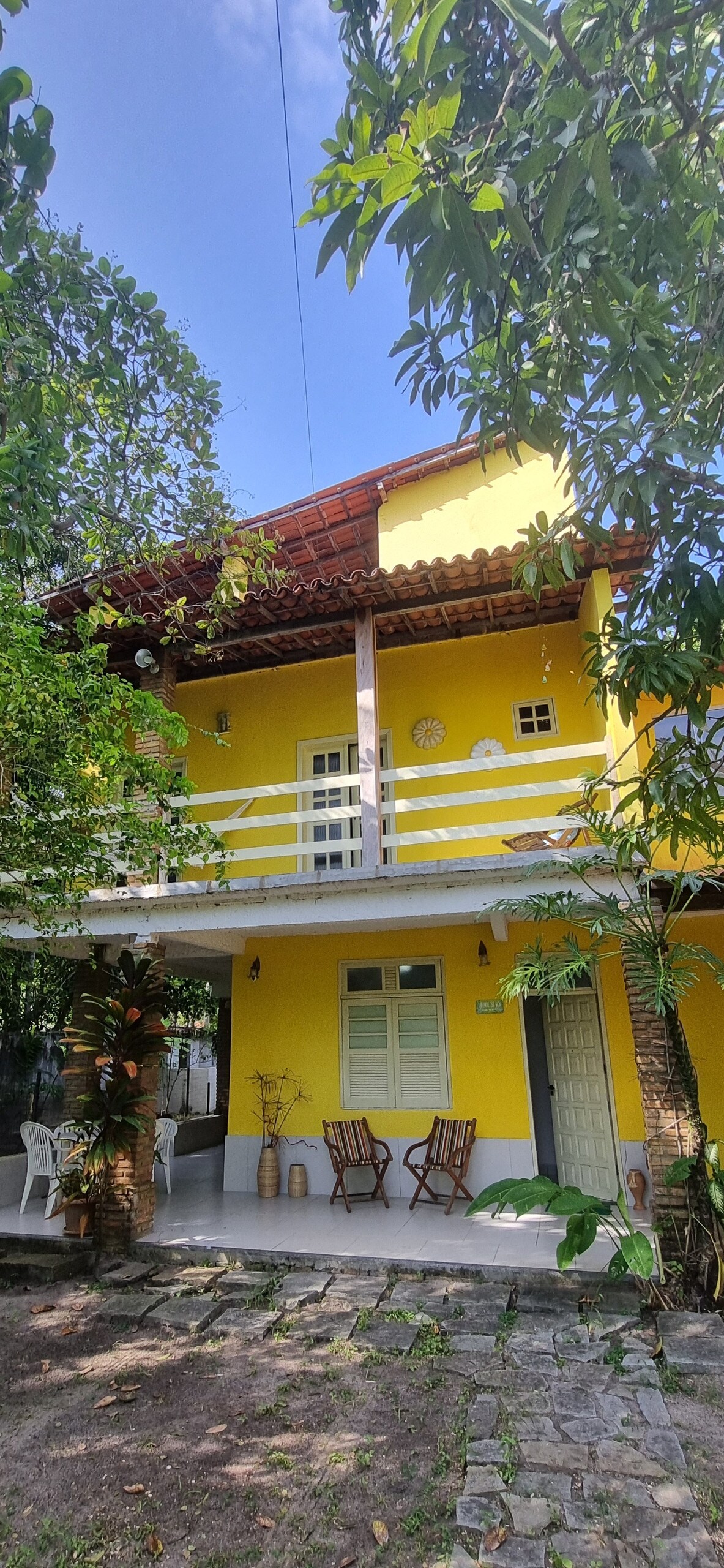 Met grote balkons heeft het 3 comfortabele slaapkamers, 3 badkamers, prachtige tuin met cashewboom, kokosnoot en struiken, vol vogels, praktische en ruime keuken, met keukengerei en tafel voor maximaal 7 personen. Huis met eigentijdse architectuur, in beton en hout, dicht bij geweldige restaurants, markten, bars en het fietspad. Het ligt in een woon- en met bomen omzoomde straat, op 800 meter van het strand van Imbassaí. Je kan alles te voet doen, maar er is ruimte om een auto op te bergen.