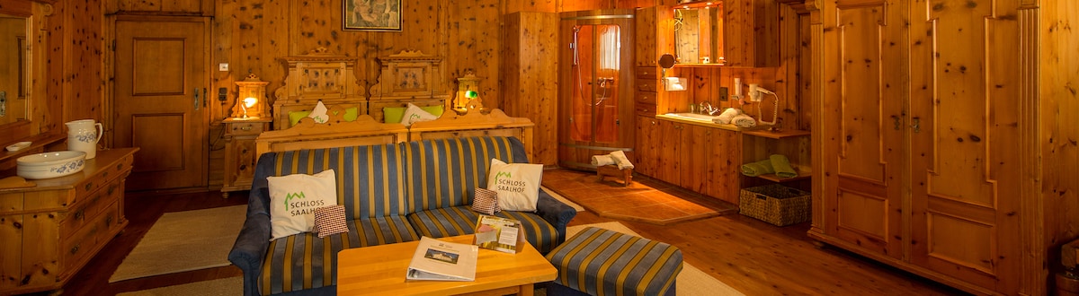 Appartement Zirbenstube Slaap als koning en koningin… voor max 2-3 volwassenen + kind Geniet van de originele alpine sfeer: we garanderen de beste slaap die je ooit hebt gehad in de gezonde smaak van Zwitserse stenen den - neem de lift naar de 2e verdieping van het kasteel 1 tweepersoonsbed, 1 eenpersoonsbed en 1 uitschuifbare bank (140 x 200 cm) - uitzicht op de bergen - geïntegreerde badzone met speciale houten douche past perfect bij de sfeer - aparte keuken - een apart toilet