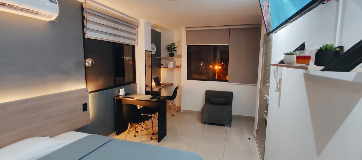 Welkom bij La Vista Suite, een moderne, comfortabele en vol luxe ruimte, gelegen in het prestigieuze City Suites Luxury-gebouw, aan de Av. Benjamín Carrión, ten noorden van Guayaquil. Wij bieden 24/7 beveiliging bij de receptie en privéparkeergelegenheid. De strategische locatie ligt op vijf minuten van het CC. City Mall en La Rotonda, en 15 minuten van het Amerikaanse consulaat. Tijdens je verblijf kun je genieten van gemeenschappelijke ruimtes, zoals een overdekt zwembad om te ontspannen en een volledig uitgeruste fitnessruimte.