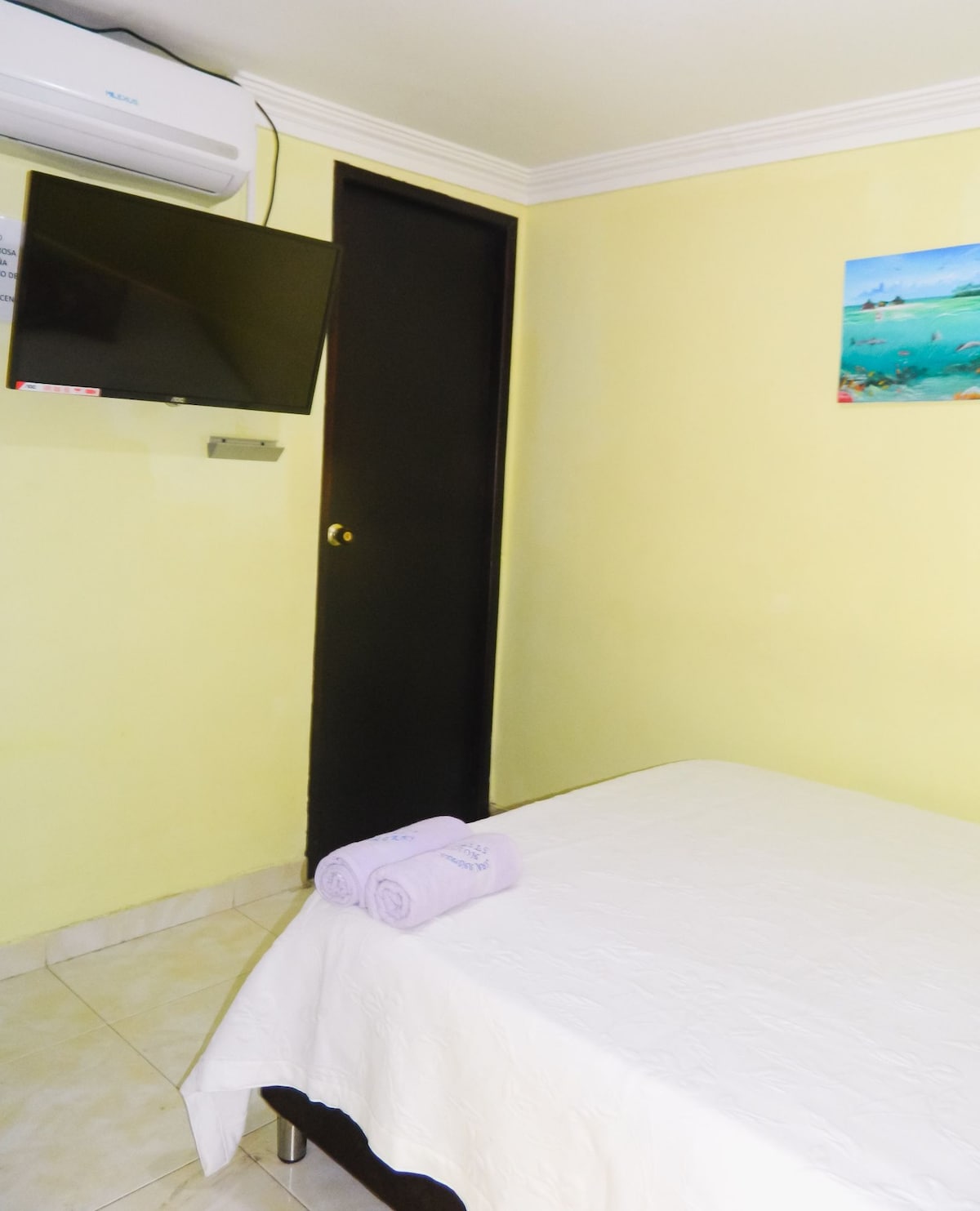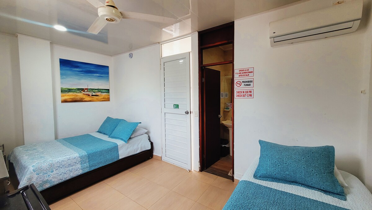 de zes-slaapkamer, gelegen in het Victors Vip hotel, is gelegen op het eiland San Andrés, naast het prachtige uitzicht Het is geschikt voor 6 personen, het heeft een tweepersoonsbed en een stapelbed, de kamer heeft airconditioning, uitzicht op de oceaan, nebecon om drankjes of voedsel op te slaan, een eigen badkamer, tv en zijn eigen sleutels het hotel ligt op een steenworp afstand van de luchthaven, diagonaal aan het Maryland hotel, op 3 minuten van het strand en op 3 minuten van het centrum van San Andrés