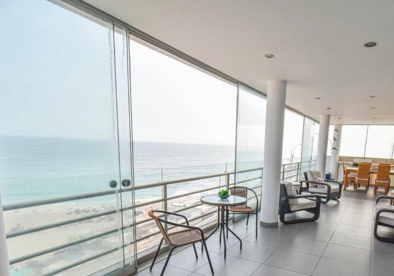 Prachtig appartement met spectaculair uitzicht op de oceaan in Caballeros Beach - Punta Hermosa. 3 slaapkamers + 1 aparte buitenkamer 3 badkamers WiFi 3 tv's met kabel Terras Zwembad Barbecueplaats Volledig uitgeruste keuken en apparaten 1 parkeerplaats voor 2 auto's 2 nabijgelegen toegangspunten tot het strand