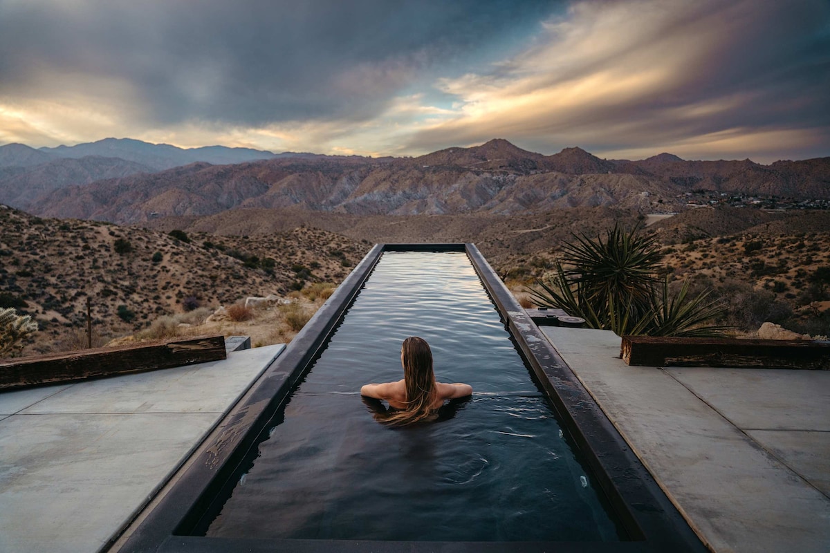 Welkom bij Quail Wash Retreat (IG: @land_and_stay), je eigen woestijnresort van 25 hectare. Dit luxe boho-toevluchtsoord combineert samengesteld design (Anthropologie/RH) met de rauwe geest van Joshua Tree. Ontdek de ultieme ontsnapping met onze exclusieve Star-Gazing Dome, panoramische sauna, koud bad, bubbelbad en cowboyzwembad. Ervaar diepe afzondering, adembenemende uitzichten en ongeëvenaarde nachtelijke hemels - compleet met gratis lokale koffie en Bourbon - op slechts enkele minuten van het National Park en het centrum.