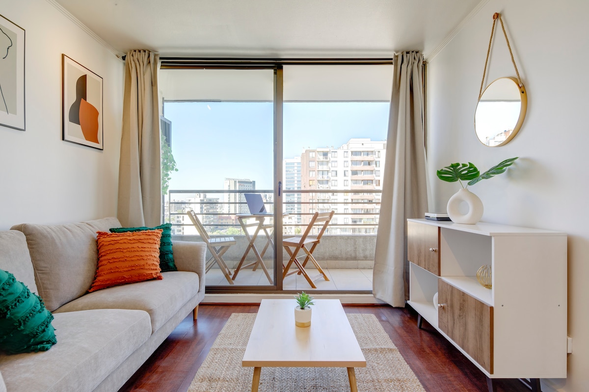 Modern appartement in Bellavista/Providencia, op loopafstand van Metro Salvador. Perfect voor stellen of zakenreizigers. Geniet van ultrasnelle wifi (561 Mbps), een lichte slaapkamer met een tweepersoonsbed, een volledig uitgeruste keuken, een gezellige woonkamer en een eigen balkon met uitzicht op het groen. Het gebouw biedt een wasruimte, lift en 24/7 beveiliging. Uitstekende locatie in de buurt van San Cristóbal Hill, Patio Bellavista en restaurants.