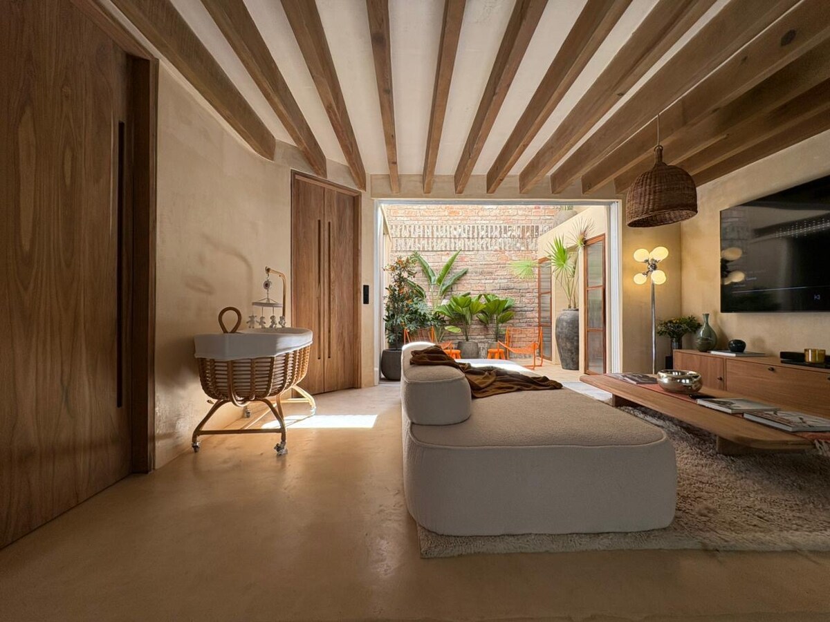 Welkom in Coyoacán! Geweldige loft van 120 m2 gelegen op slechts vijf minuten lopen van het centrum van Coyoacan. Beleef de ervaring van deze rustige en verlichte open ruimte, ideaal om te rusten of te werken en ingericht met objecten vol verhalen. De loft is gelegen op de derde verdieping van Casa Mavi, een oude fabriek die is gerenoveerd om een plek vol charme te creëren die het uniek maakt. Het heeft terrassen voor gemeenschappelijk gebruik. Met optie voor een derde gast. Wifi 200 megabytes.