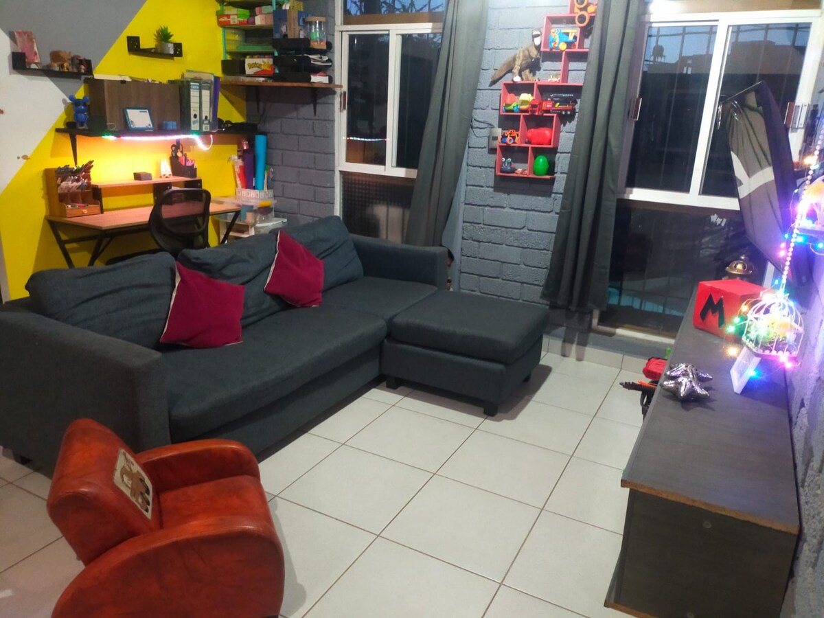 Welkom in mijn appartement, gelegen op de derde verdieping en ingericht met werken van kunstenaars en Oaxaca ambachten om je onder te dompelen in onze cultuur. Vanwege de locatie heb je het stadscentrum op 12 minuten rijden, de archeologische zone van Atzompa 10 minuten, een winkelplein 5 minuten en zelfbedieningswinkels. Het heeft ook een eigen parkeerplaats en een panoramisch uitzicht. De welkomstmezcal is van het huis.