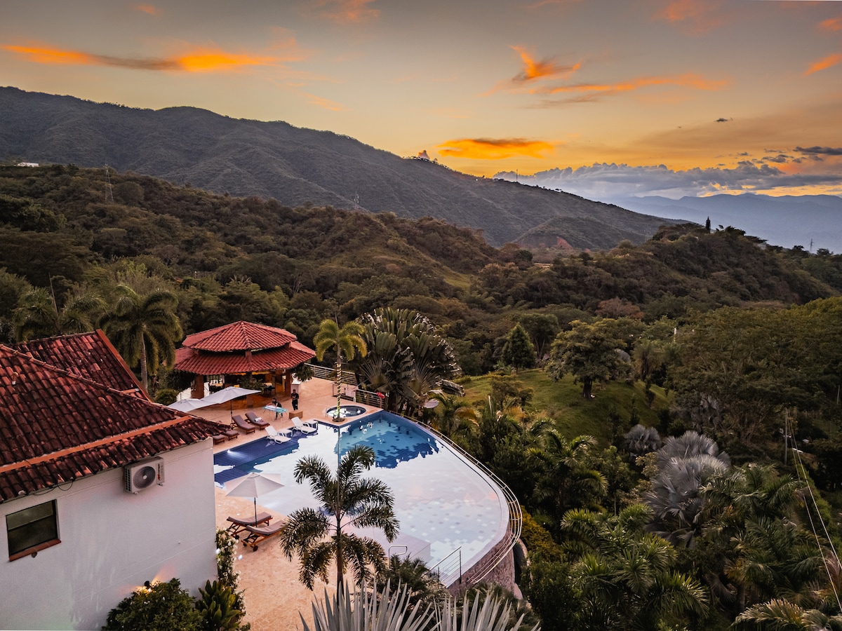 Ontsnap naar deze moderne en luxe villa met 7 slaapkamers in San Jerónimo - ideaal voor gezinnen en grote groepen. De accommodatie wordt omgeven door weelderige tuinen en een adembenemend uitzicht op de bergen en beschikt over een privézwembad, een buitenbubbelbad, een thuisbioscoop, een pooltafel en een stijlvol interieur. Geniet van totale privacy, eersteklas voorzieningen en een van de beste klimaten van Colombia. Of je nu ontspant of iets viert, deze villa biedt de perfecte omgeving voor onvergetelijke momenten.