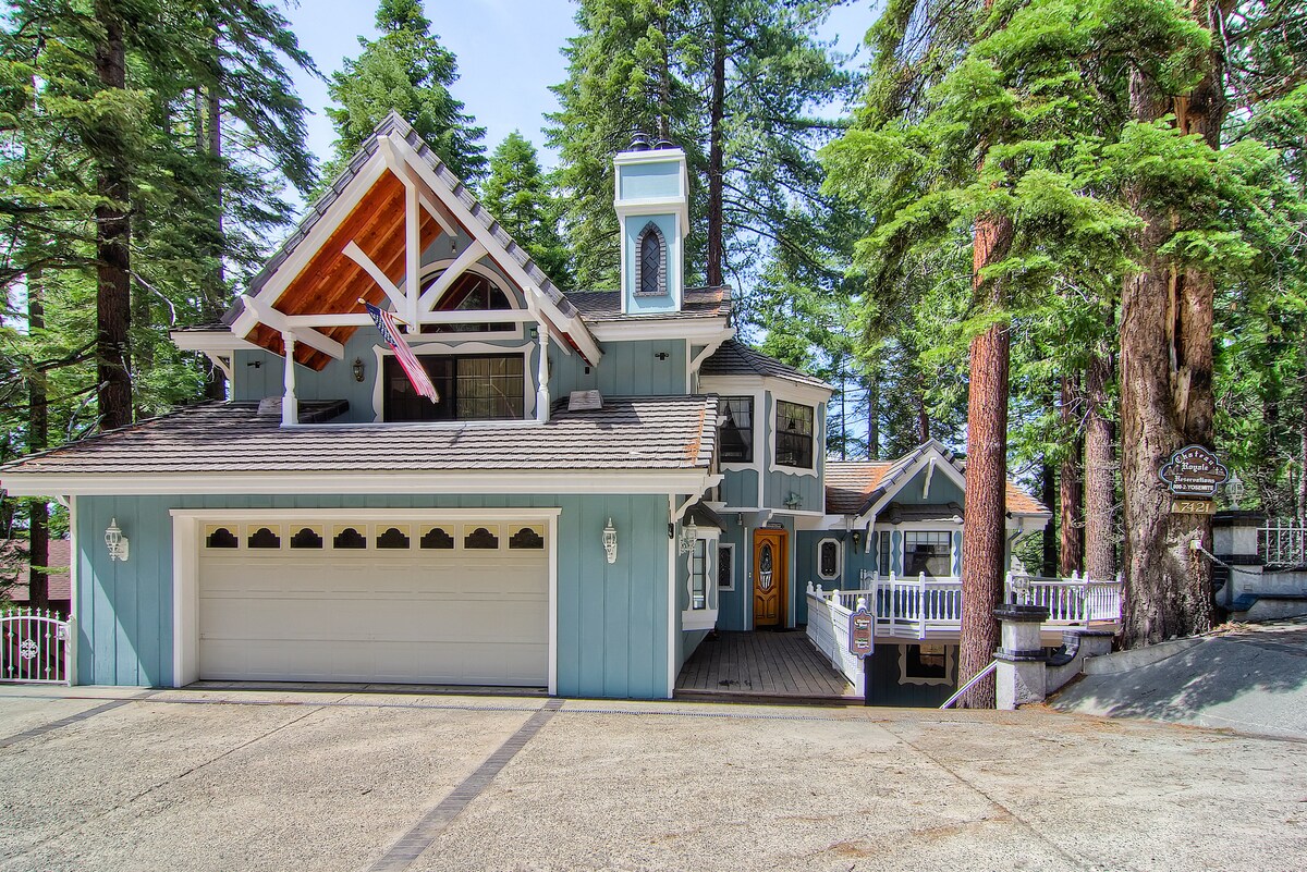 *Incredible views from upscale 3-story Blue Lake Springs chalet *Walk 1/2 mile to private pool, lake, tennis, pickleball, beach, restaurant & more *Private hot tub with views *Big rec room: pool, ping-pong, air hockey, darts, 3 arcades, gas fireplace, TV, foosball *Whole-house generator, AC, huge 70" TVs *30 min to Bear Valley skiing, 10 min to Big Trees, dog ok *Book 3 nights, get 4th free in Oct—message for deal