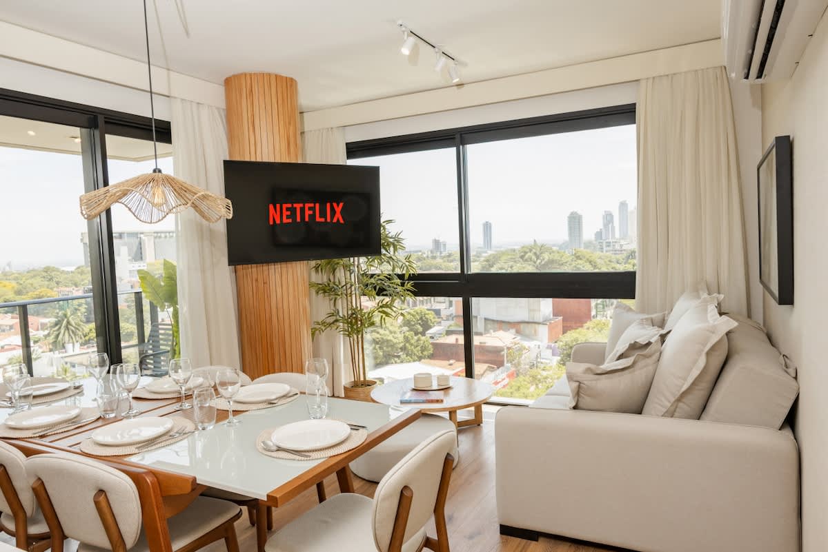 Stay in Paraguay’s tallest tower with full hotel-style comfort. This modern apartment offers stunning skyline views, premium furniture, high-speed WiFi, smart TV, and a fully equipped kitchen. Enjoy 24/7 security, fast elevators, and an unbeatable location near top restaurants, cafés, malls, and corporate centers.