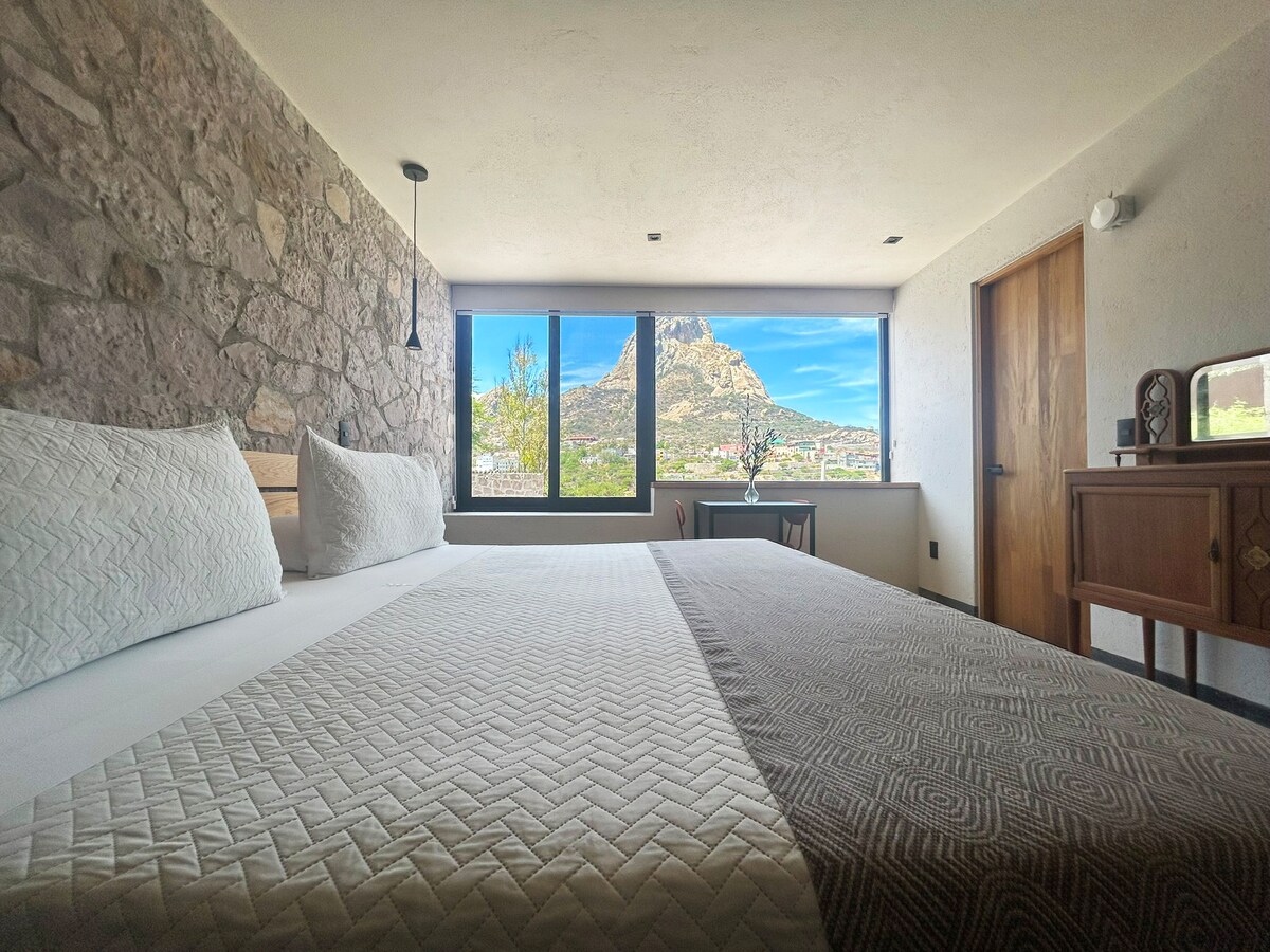 Ontspan in deze rustige en elegante suite met toegang tot het hele huis, zodat je kunt genieten van privacy, comfort, design en een uniek uitzicht op de Peña de Bernal in een enkele ruimte. Gelegen op een exclusieve heuvel, binnen een privé is Villa Casa Loma dat we nu hebben gekozen om zijn deuren te openen voor koppels die willen genieten van de onverslaanbare diensten van een huis.