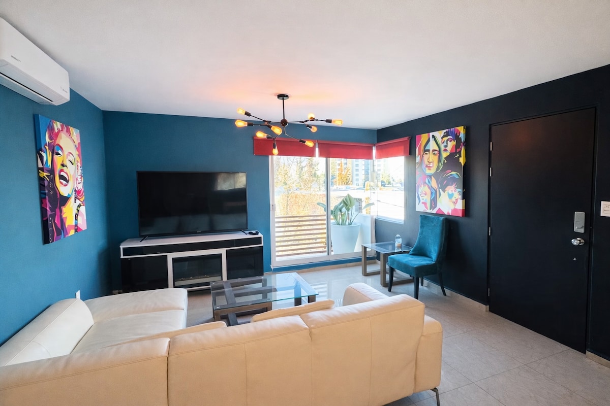 Modern apartment on the second level located in Virreyes, San Luis Potosí. Capacity for 7 people with 2 double beds and 1 king. It has air conditioning, WiFi, Smart TV, balcony, equipped kitchen, washing machine, dryer and parking. Spacious and comfortable spaces, ideal for families, groups or long stays. Excellent option for work or rest.