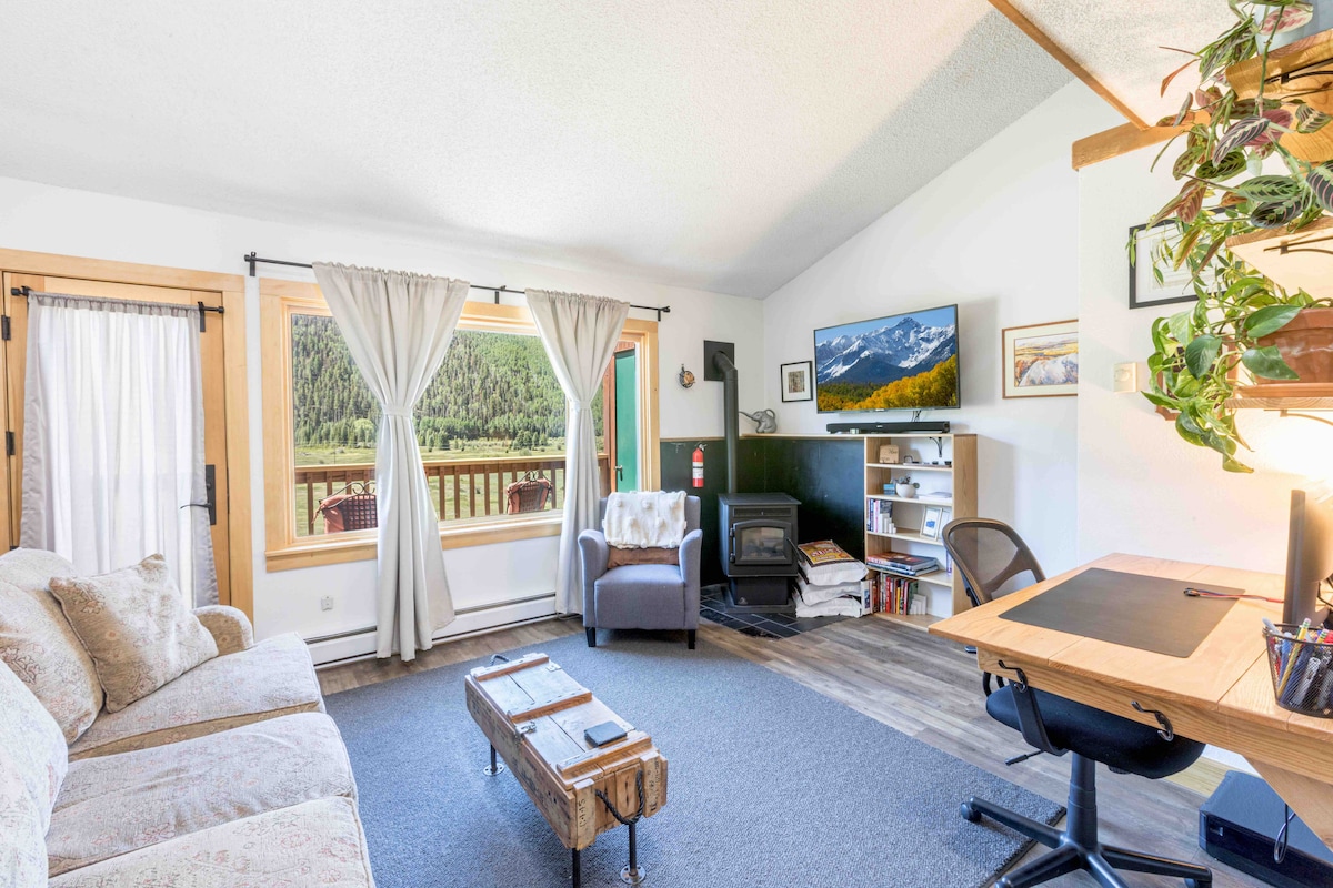 Dit prachtige appartement is gunstig gelegen op de prachtige Valley Floor. Een 2 mijl lopen, fiets, bus, of rijden naar Telluride. Geniet van veel natuurlijk licht, een eigen terras, een open haard, gewelfde plafonds en comfortabele bedden. De omgeving is ideaal voor koppels, solo-avonturiers, zakelijke reizigers en gezinnen die op zoek zijn naar een plek om te ontspannen na het skiën, wandelen of genieten van het zomerfestival. Met een complete keuken, badkamer (met bad), wasmachine en droger, en alles wat je nodig hebt voor je verblijf.