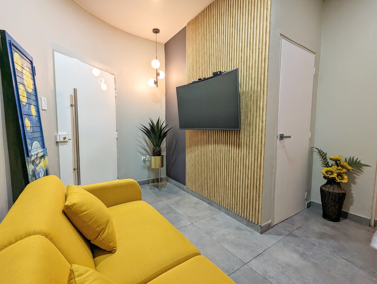 Elegant design, a/c; dicht bij bezienswaardigheden, restaurants, ziekenhuizen en winkels. Privé, veilige accommodatie, - Woonkamer met sociale badkamer, slaapbank en smart-tv - 1 kamer met een queensize stapelbed, badkamer in de kamer - Ontbijtbar om van je Delibery-eten te genieten, koelkastbar (je moet hem aanzetten als je aankomt) magnetron Speciale zorg bij het schoonmaken. Ik bied wc-papier, zeep voor lichaam,shampoo, conditioner Parkeren (extern) Draagbaar bureau met Rodos