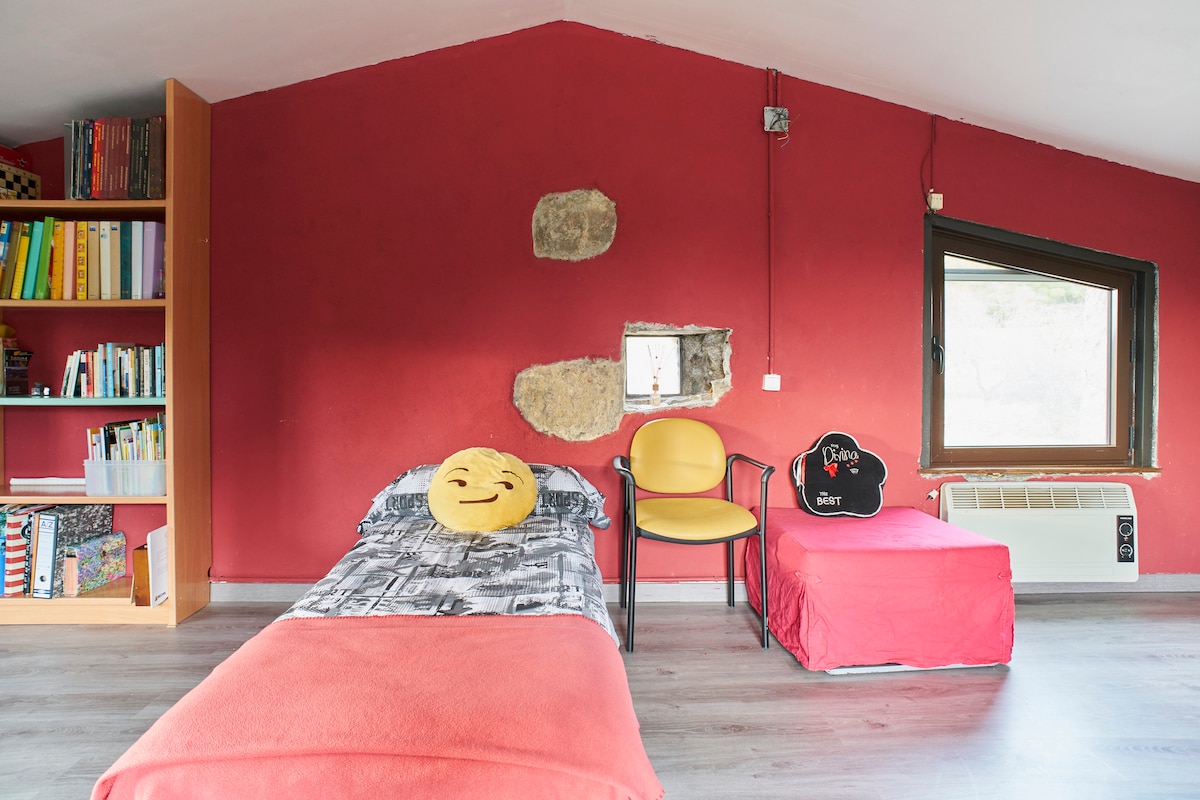 De schuur heeft een woon-eetkamer met een zwarte keuken, een slaapkamer met een tweepersoonsbed, een zolder met twee bedden en een slaapbank in de woonkamer. Er is ook een dubbele douche met raam, zodat je de natuur tijdens het douchen kunt bewonderen. Open haard, zwembad en rivier. En een omgeving met een monumentaal complex bestaande uit een romaanse kerk met crypte, een modernistische begraafplaats en Iberisch dorp op vijf minuten afstand. Spectaculair! 5 min van een landelijk restaurant en 10 min van het dorp/stad.
