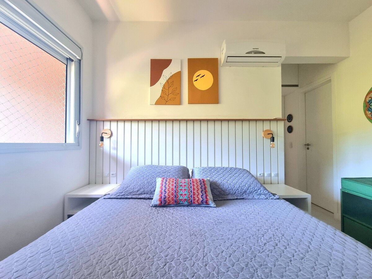 Appartement in Condomínio Boutique met zwembad in Bairro Novo Campeche op 150 meter van het strand. Twee slaapkamers met airconditioning, één suite. Bedlinnen en handdoeken. Parasols en stoelen. Kamer met streaming-tv. Glasvezel internet. Volledige keuken. Service met wasmachine en droger. Balkon met barbecue. Twee parkeerplaatsen. Zelf inchecken. Laptopwerkplek. Huisdiervriendelijk.