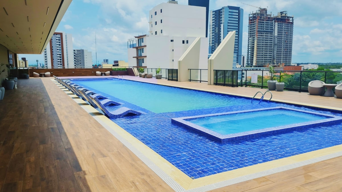 Luxe appartement met één slaapkamer in de beste en veiligste buurt in Santa Cruz de la Sierra, dicht bij belangrijke punten in de stad. Dit appartement van 50 m2 verwelkomt 4 personen. Wat dit appartement op de 5e verdieping biedt: - Woonkamer met50inch TV - 1 slaapkamer met een queensize bed - Volledig uitgeruste keuken - 1 Badkamer - Slaapbank voor 2 personen - Wifi - Schoonmaakbenodigdheden - Koffie, suiker, zout, thee, olie en azijn - Eigen parkeerplaats Het gebouw biedt: - Zwembad op het dak - Speelkamer - Bioscoop - Grill Fitnessruimte