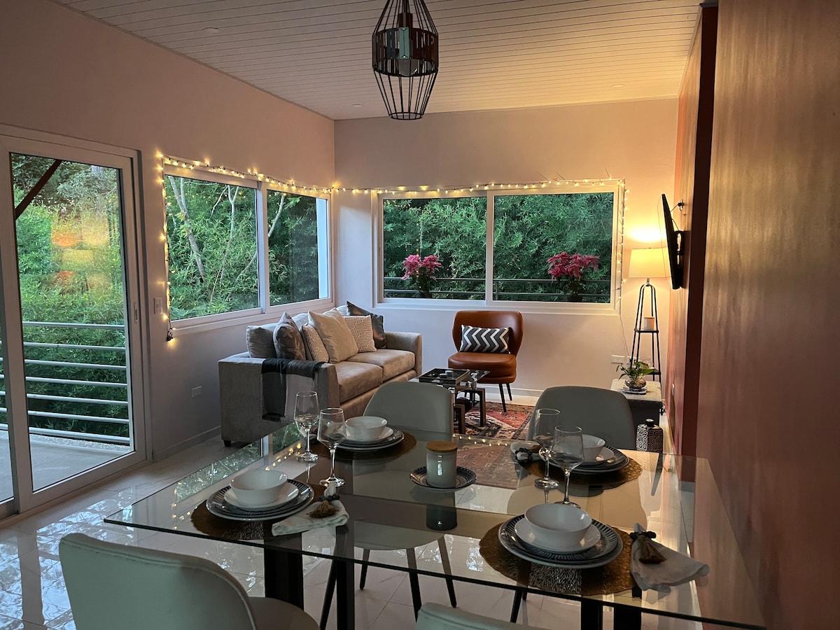 Deze unieke plek heeft een geheel eigen stijl. Geniet van dit ruime appartement met één slaapkamer midden in een goed onderhouden natuurlijke sfeer. Het heeft een woonkamer, eethoek, volledige keuken, suite met één slaapkamer en een geïntegreerde badkamer in de natuur. Ook voor je plezier heeft het een sereen terras met een hangmat en het is omgeven door een bamboebos.