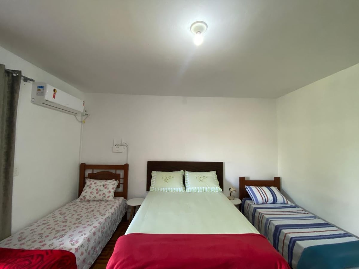 É uma casa familiar, ela fica toda disponível para os hóspedes; Fica a 3 quarteirões da praça central da cidade, perto de restaurantes e lancherias Wi-Fi liberado Tv 65° smart com IPTV 2 quartos (1 quarto com ar condicionado) 1 ar condicionado na sala Além de 3 camas (2 colchões de casal e 1 solteiro) ainda disponibilizamos mais 2 colchões de casal e um sofá cama 1 ventilador grande Aproveite o fácil acesso a lojas e restaurantes populares ficando neste espaço charmoso