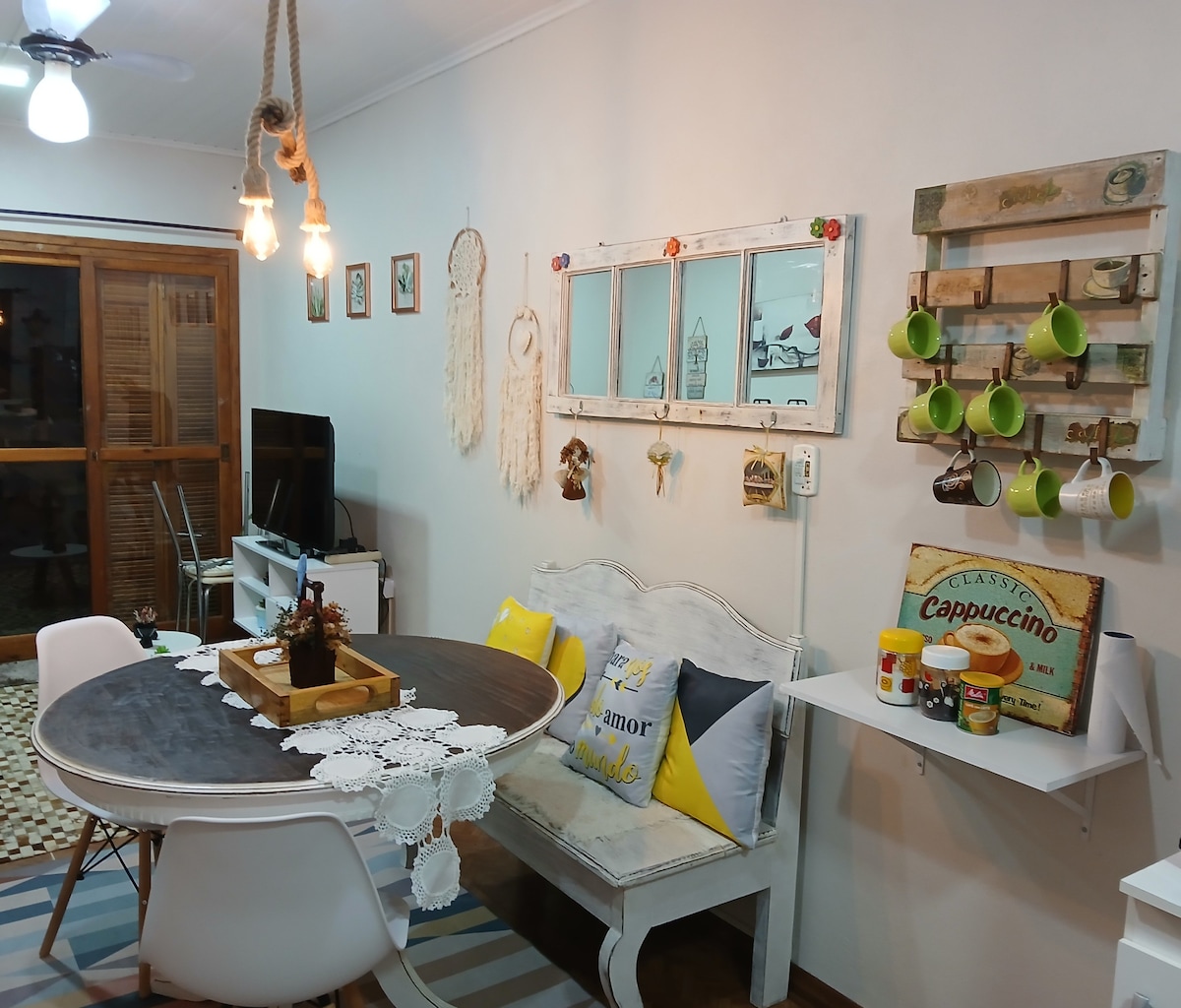 Compleet huis in São Lourenço op steenworp afstand van Laguna dos Patos. De ruimte omvat een afgesloten privé patio met barbecue, hangmat, parkeerplaats en pergola met wijngaard. Het heeft ook binnenvoorzieningen zoals airconditioning, wifi en een tv.