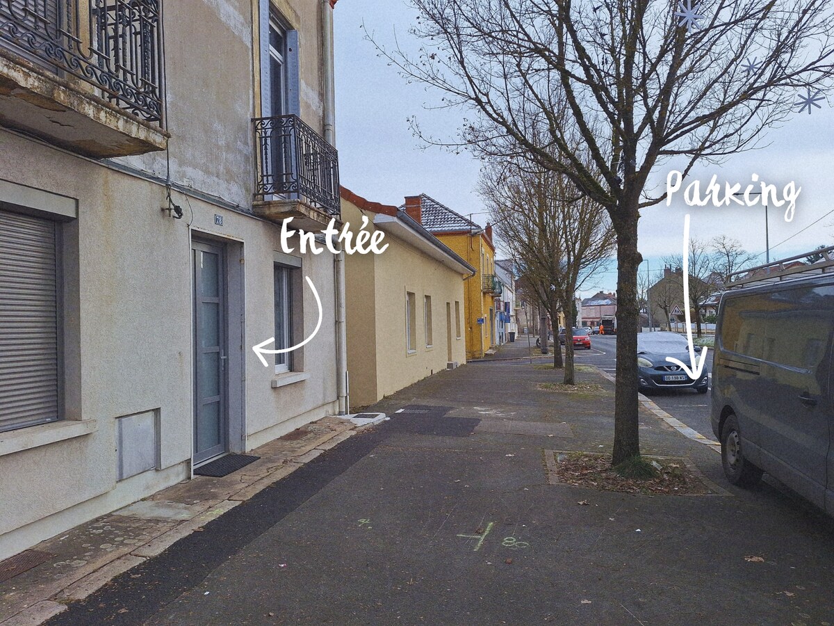 Dit appartement is ideaal gelegen dicht bij het centrum van Bourg en Bresse en het treinstation. Het is ideaal voor elke reis: professioneel, stel, familie of vrienden. Gemakkelijke toegang vanaf het treinstation (5 minuten lopen) of met de auto (parkeerplaatsen net onder). Om bij het stadscentrum (winkels, restaurants) te komen, duurt het een paar minuten lopen of je kunt gebruik maken van het openbaar vervoer in de buurt. Wifi en tv. Huisdieren zijn welkom.