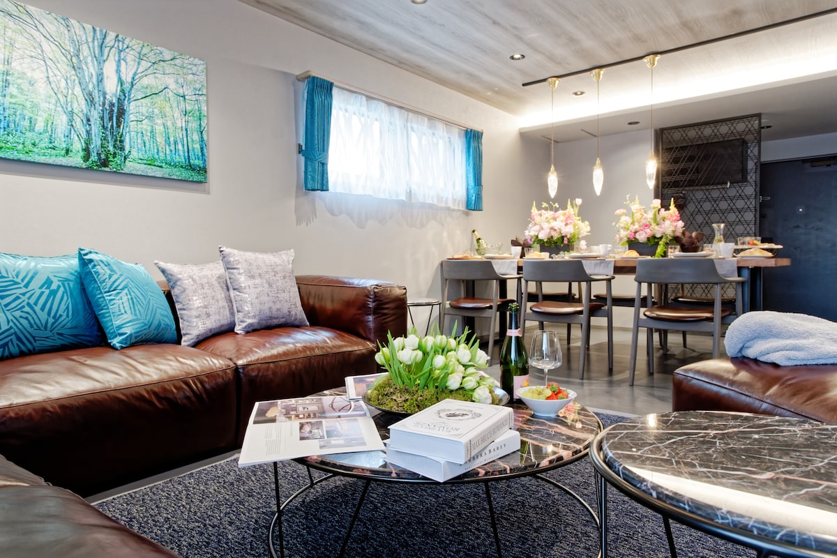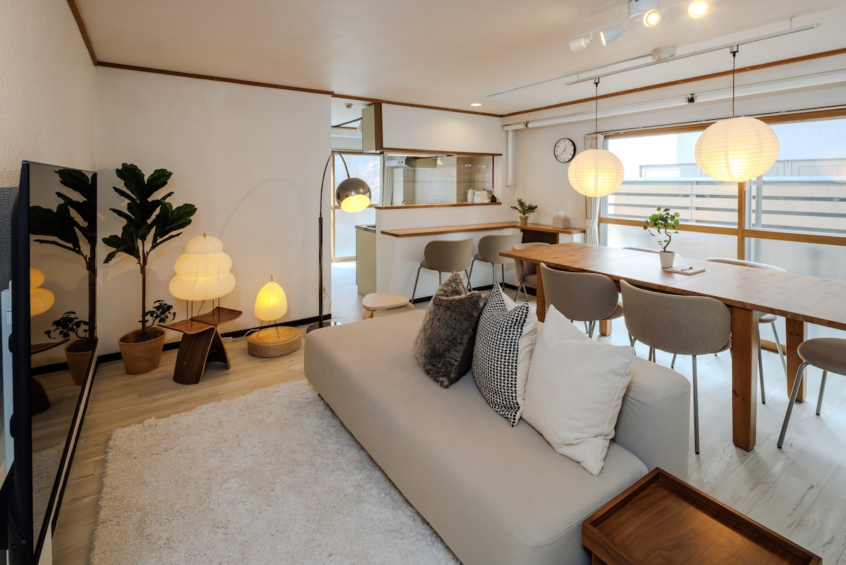 Deze ruime 2LDK(51㎡) kamer in Sapporo biedt comfort. Met 3 tweepersoonsbedden kunnen maximaal 6 gasten verblijven - perfect voor gezinnen of groepen. Het interieur heeft een grijs monotoon palet met zwart en bruin meubilair, waardoor een schoon, subtiel gevoel van luxe ontstaat. Hoge plafonds met designverlichting en een ronde eettafel vormen een gezellige woonruimte waar iedereen van nature samenkomt. Goed uitgerust voor een langer verblijf, waaronder een badkamer met een bad, een aparte wastafel, een wasmachine-droger en een complete keuken.
