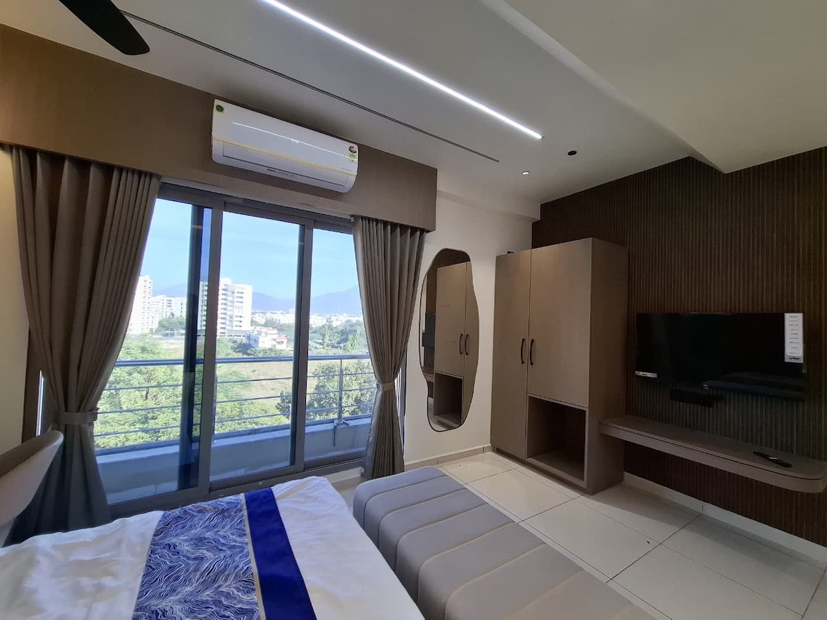Ervaar een premium verblijf in dit luxe 2BHK appartement in Sapphire Urban Living, GIFT City. Perfect voor zakenreizigers of gezinnen, het beschikt over 2 elegante slaapkamers, 2 moderne badkamers, een volledig uitgeruste keuken, smart-tv, snelle wifi, airconditioning en een eigen balkon. Gelegen in een rustig, veilig complex in de buurt van het clubhuis en belangrijke zakelijke zones. Professioneel schoongemaakt met schoon beddengoed. Ideaal voor kort of langer verblijf.