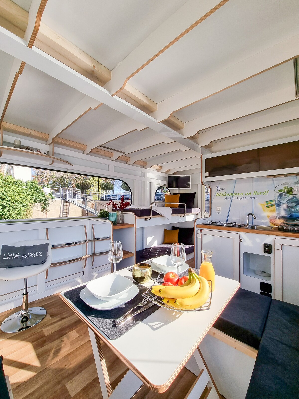 In Potsdam Havel Bay is onze prachtige woonboot gelegen en biedt niet alleen een ontspannend toevluchtsoord aan het water, maar ook een unieke ervaring die je nergens anders in de stad vindt. Met goede voorzieningen, een panoramisch terras en de toplocatie biedt onze woonboot een onvergelijkbare mix van luxe, comfort en avontuur. Het is de perfecte keuze voor iedereen die op zoek is naar een onvergetelijk en speciaal verblijf.
