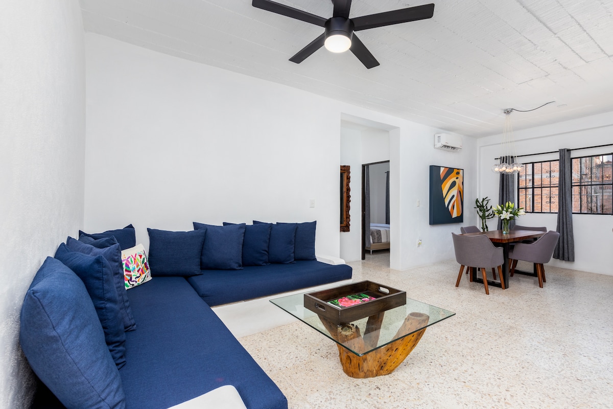 A self-contained apartment in a renovated historic building located away from the bar/beach revelry but a 6 minute level walk to shops, the town square and beaches. Private terrace overlooking street, king bed with high quality linens and dream kitchen with 6 burner stove. Living room has 2 built-in sofas which make into comfortable single beds when needed. ACCESS TO BUENA VISTA GARDENS and POOL (w/great VIEWS by way of our private jungle path behind villa (many steps but worth it)