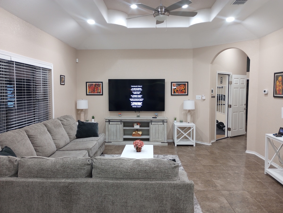 Hoi! We hebben veel liefde in huis gestoken en hopen van je verblijf een geweldige ervaring te maken. - Gunstig gelegen nabij I35, FM1604, RAFB, op 5 minuten afstand van IKEA en veel restaurants - tweezorgsgarage met veel ruimte voor twee auto 's in de garage en extra parkeergelegenheid op de oprit - Super veilige gezinsvriendelijke en rustige buurt met Live Oak PD die in de omgeving patrouilleert. Live Oak PD en Fire Dept in de buurt - 9 slaapplaatsen - SMART-TV met verstelbare arm en veel zitplaatsen - wasmachine en droger