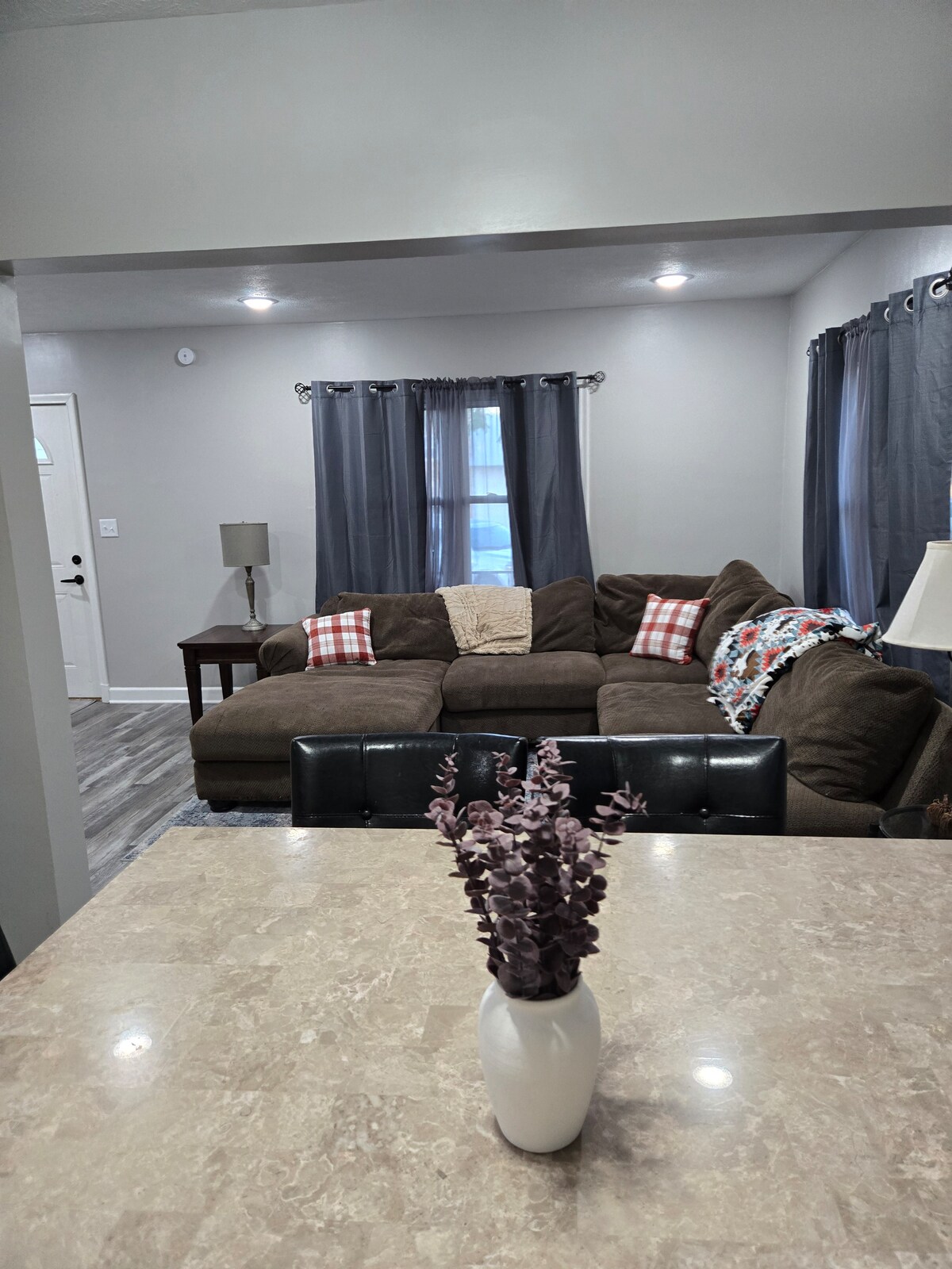 Stap in een privé en gezellige ruimte. Ontspan om tv te kijken in bed of op de bank. Deze plek maakt deel uit van onze uitloopkelder, dus je kunt van dag tot dag boven horen wonen. Voor je eigen veiligheid is er een ringcamera geïnstalleerd bij de ingang en deze zal de ingang verlichten als het donker is. Parkeren is in de goed verlichte openbare straat. Loop gemakkelijk langs onze toegewijde stoep van Airbnb, geen trappen, loop rond naar de achterkant van het huis. Je bevindt je in een serene ruimte waardoor je direct thuis voelt.