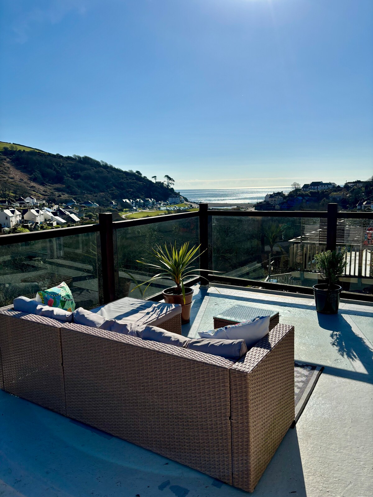 Our bright, airy self-contained flat offers you a relaxing retreat with glorious views out to the sea. You can look forward to sitting on your private balcony with a drink after a day on the beach, or warm up in the hot tub after a blustery walk with views down the valley to the beach. Or snuggle up on the comfy chairs reading a book or playing board games. It’s an easy walk down into the village to enjoy some local beers at the pub, or you can eat some tasty food at the village bistro.