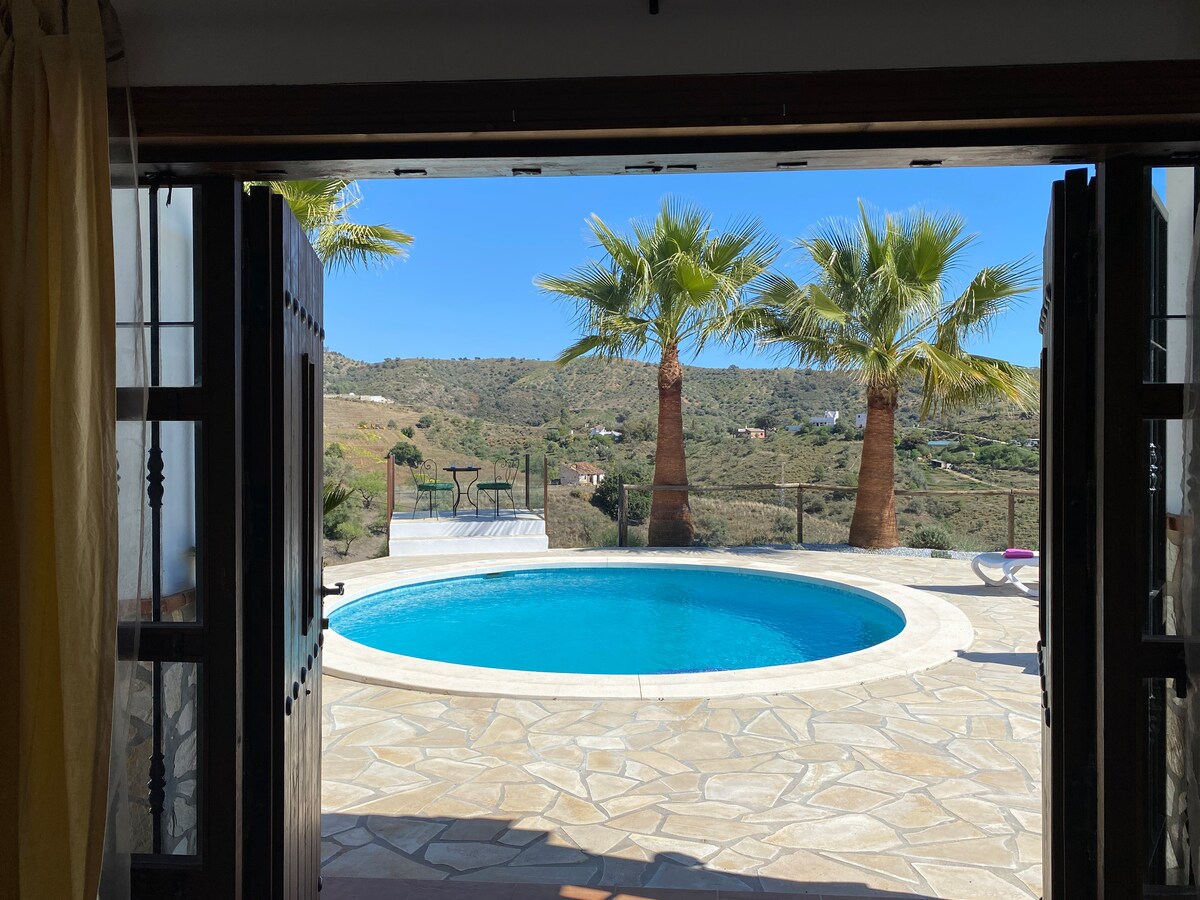 Hoge winterkorting!(17 Nov t/m 20 April) In de bergen van het prachtige natuurpark, half uur van het strand ,uur van Malaga & Grananda Schakel een tandje terug op deze unieke locatie om te wandelen, relaxen bij het zwembad of authentieke Spaanse dorpen bezoeken.s’Avonds de overdonderde sterrenhemel , overdag het zicht op de bergen en zee. Eigen douche &klein privébad & houtkachel & keukentje in de casita. Prijs incl electra en water en excl hout voor houtkachel en gas. Huisdieren in overleg