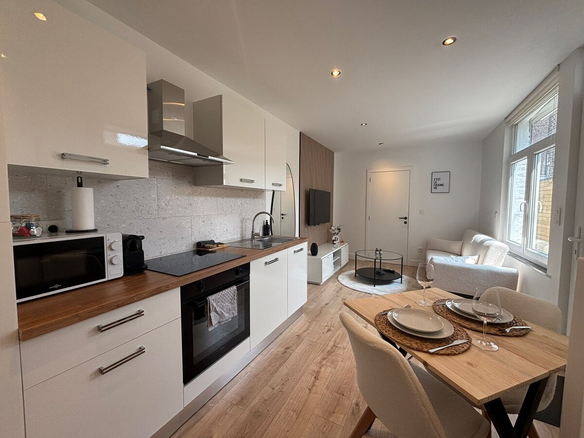 – La Parenthèse – Welkom bij La Parenthèse, een gerenoveerd appartement met een moderne en warme stijl. Geniet van een groot zonnig terras en een projector voor je filmavonden. Het appartement is volledig uitgerust, het zal je verblijf eenvoudig en aangenaam maken. Het ligt op steenworp afstand van de nieuwe tram van Luik, waarmee je de stad gemakkelijk kunt doorkruisen. Een supermarkt is op 2 minuten lopen. La Parenthèse belooft een onvergetelijke ervaring in het hart van de Lichtstad.