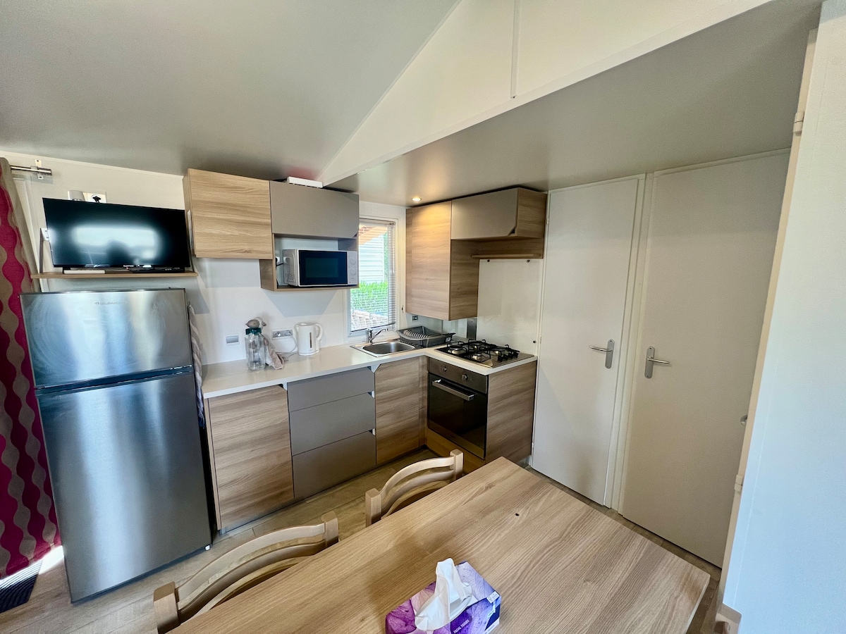 Stacaravan op een afgesloten perceel, gelegen tussen de zee en de vijver, op een veilige, rustige en familiecamping. Capaciteit 5 bedden: - 1 slaapkamer met 140 bed - 1 slaapkamer met 140 bed + 1 afneembaar kinderbedje. Elk bed is uitgerust met matrashoezen, dekbedden, kussens en steun met hun beschermende hoezen. Beddengoed (lakens, handdoeken...) kan worden verstrekt tegen een toeslag van € 20 en € 10/extra bed. Schoonmaak gedaan door gasten of tegen betaling van € 50