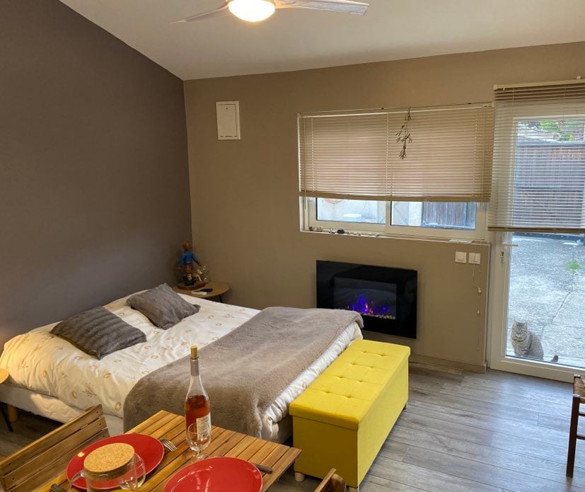 Ontspan op deze, vlakke, rustige en stijlvolle ruimte. Zelfstandige ingang. Deze studio, met moderne voorzieningen, zal je rustbubbel zijn. Grote betegelde douche, kitchenette + glaskeramiek, koelkast, kast en kledingkast maken je verblijf aangenaam. Automatische rolluiken, ingebouwde schermen en centrale ventilator zullen je welzijn verhogen. Auto, motorfietsen, fietsen op de binnenplaats, stopcontact voor het opladen van fietsbatterijen.