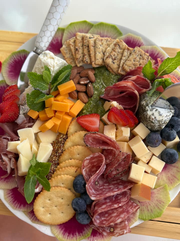 Een prachtig samengestelde selectie van seizoenskazen, met de hand gesneden ambachtelijk vlees, verse bessen en knapperige groenten, gecombineerd met gastronomische crackers, noten en zelfgemaakte begeleiding.