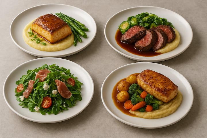 Driegangmenu's. Geamuseerde bouche, voorgerecht, hoofdgerecht, dessert en zoet, de combinatie en wijnen zijn niet inbegrepen, maar kunnen worden gedaan door een sommelier
