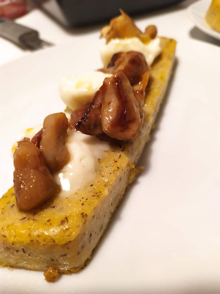 Lunch- of dinerproeverij met polenta, vergezeld van champignons, gestoofd vlees of een mix van kazen