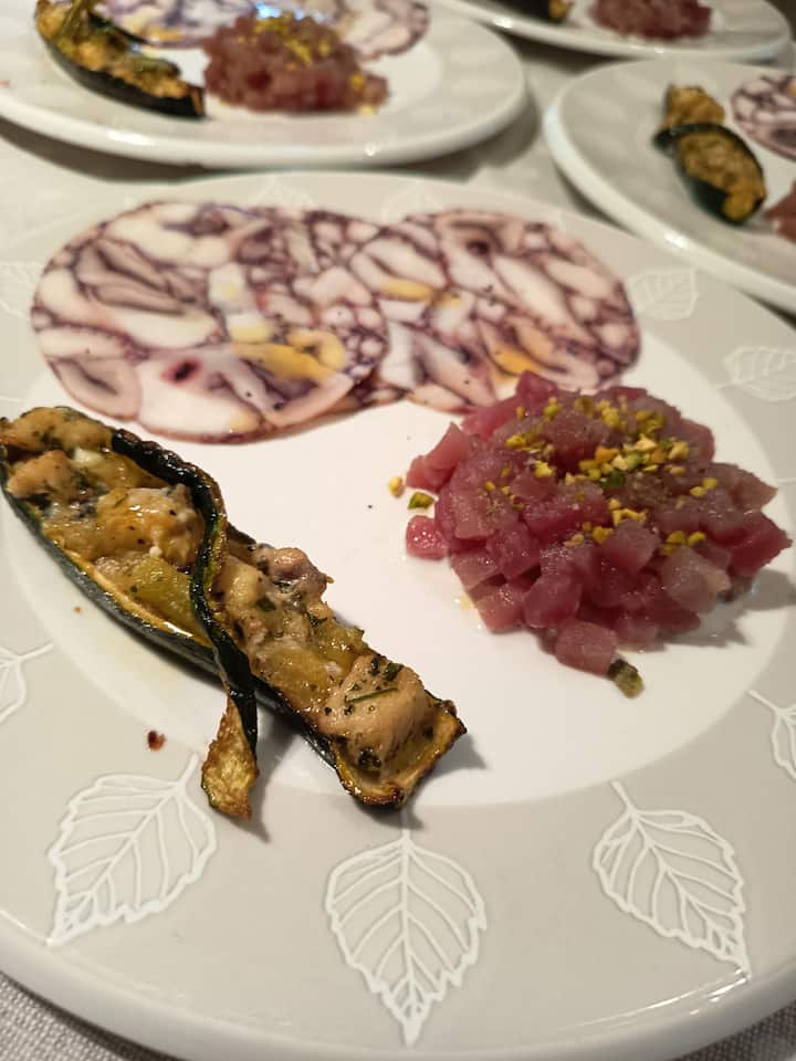 Deze selectie omvat voorgerechten met zeevruchten: octopuscarpaccio, courgette gevuld met zwaardvis en tonijnentartaar