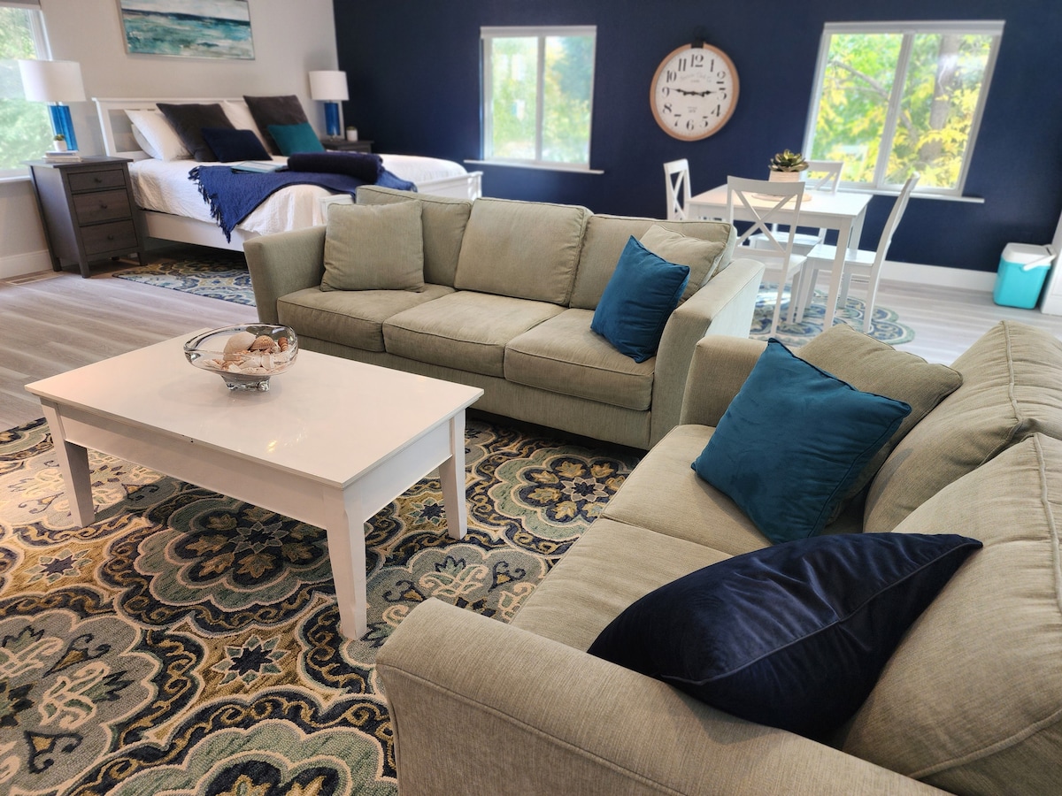 Welkom bij het Lake House! Deze gastsuite van 500 m ² kijkt uit op een meer en park. Deze prachtige locatie is nieuw, gebouwd in 2021! Via een eigen ingang vind je een grote 15'x16' studio slaapkamer met een kingsize bed, eethoek, zithoek en 60inch tv. De ruimte beschikt ook over een stapelbedkamer met een stapelbed met twee eenpersoonsbedden, een luxe badkamer en een magnetron en een minikoelkast. Ontspan en geniet van het uitzicht terwijl je op een gecentraliseerde locatie in Loveland verblijft. Slechts 2 mijl van I-25 en 1 mijl van snelweg 34!