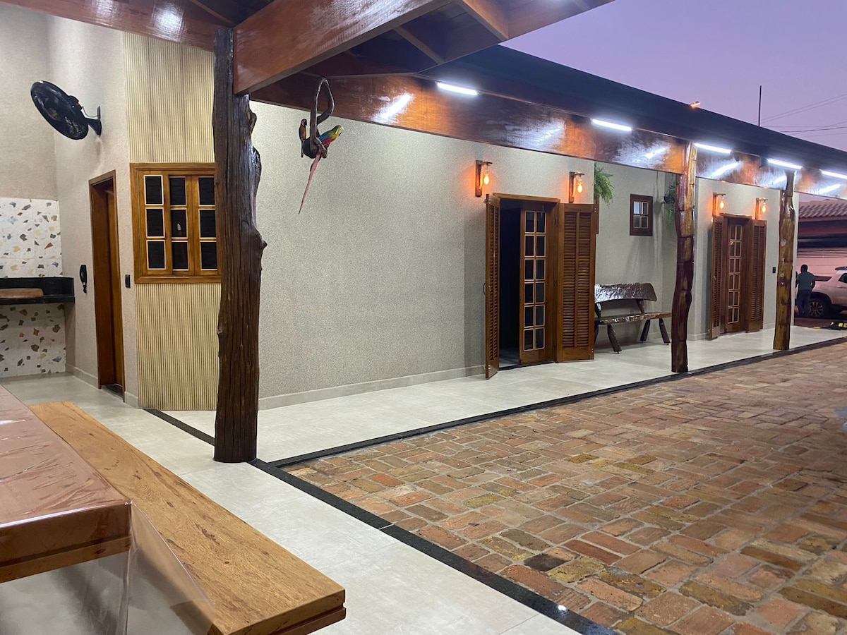Goed gelegen en uitgerust huis heeft twee kamers met airconditioning en plafondventilator. Gebakken hele barbecueplek en zwembadkamer met tv Dichtbij markt, bakkerij, apotheek, slagerij, benzinestation 4 km van Thermas dos Laranjais, Hot Beach, Dinosaur Valley en andere toeristische attracties